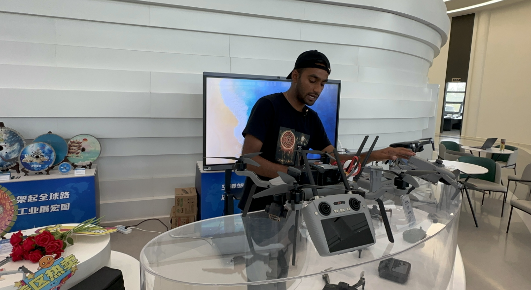 在机场的带动下,中部小城鄂州越来越有国际范儿。下午3点,位于鄂州市临空经济区的中国(鄂州)跨境电商产业园直播中心内,来自巴基斯坦的洋主播正在直播间向北美消费者推荐无人机;而在二楼的展销区,东南亚爆款女装,欧美畅销的电子产品、玩具手办等琳琅满目。