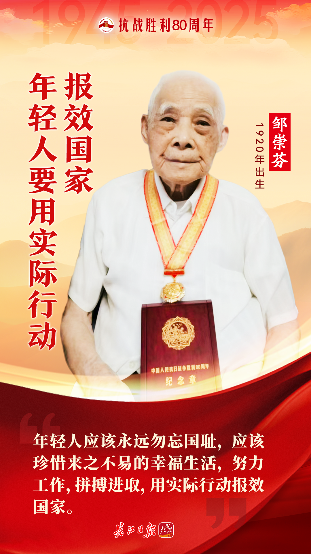 邹崇芬说:“我一生没有做过什么大事,但值得欣慰的是,我参加了抗战,尽了保家卫国职责。我经常教育孩子们,要永远记住自己是中国人,要爱自己的国家。在中国共产党的领导下,中国发生了翻天覆地的变化,年轻人应该永远勿忘国耻,应该珍惜来之不易的幸福生活,努力工作,拼搏进取,用实际行动报效国家。”