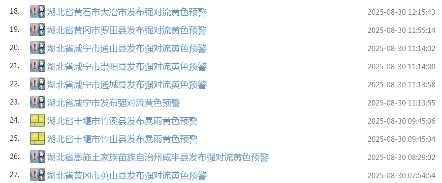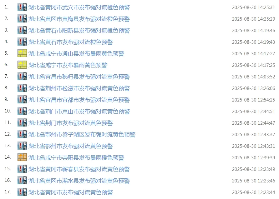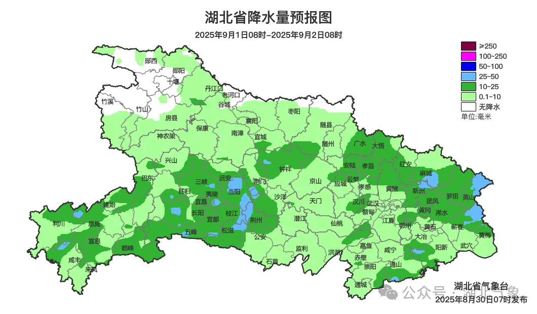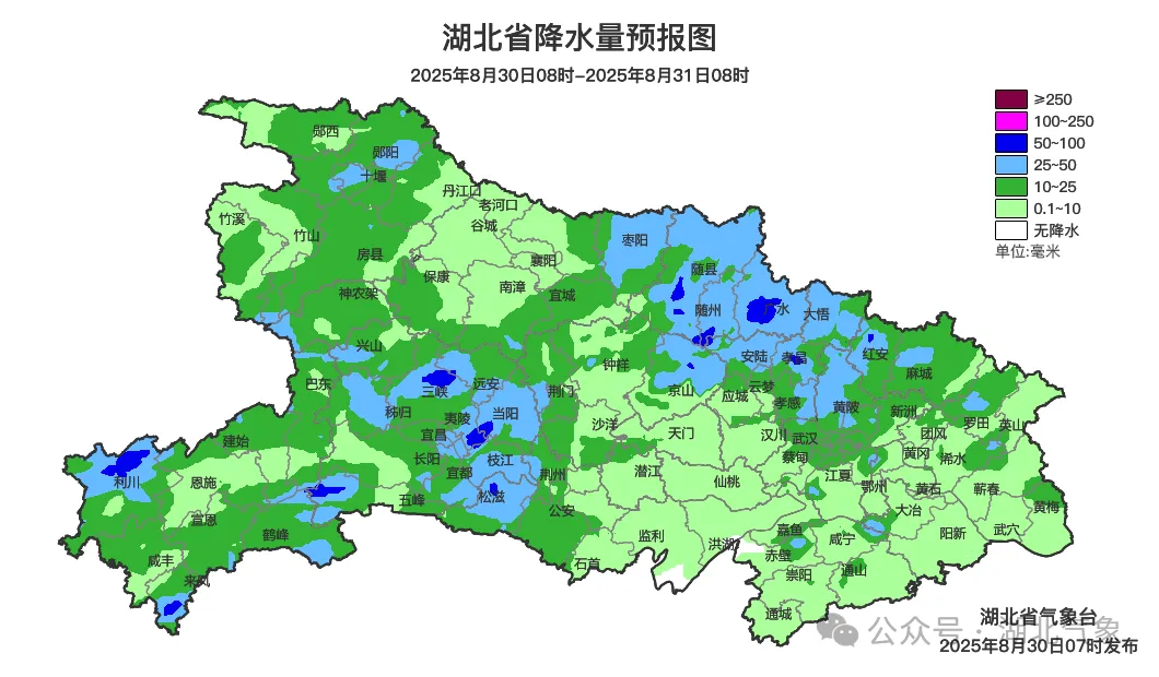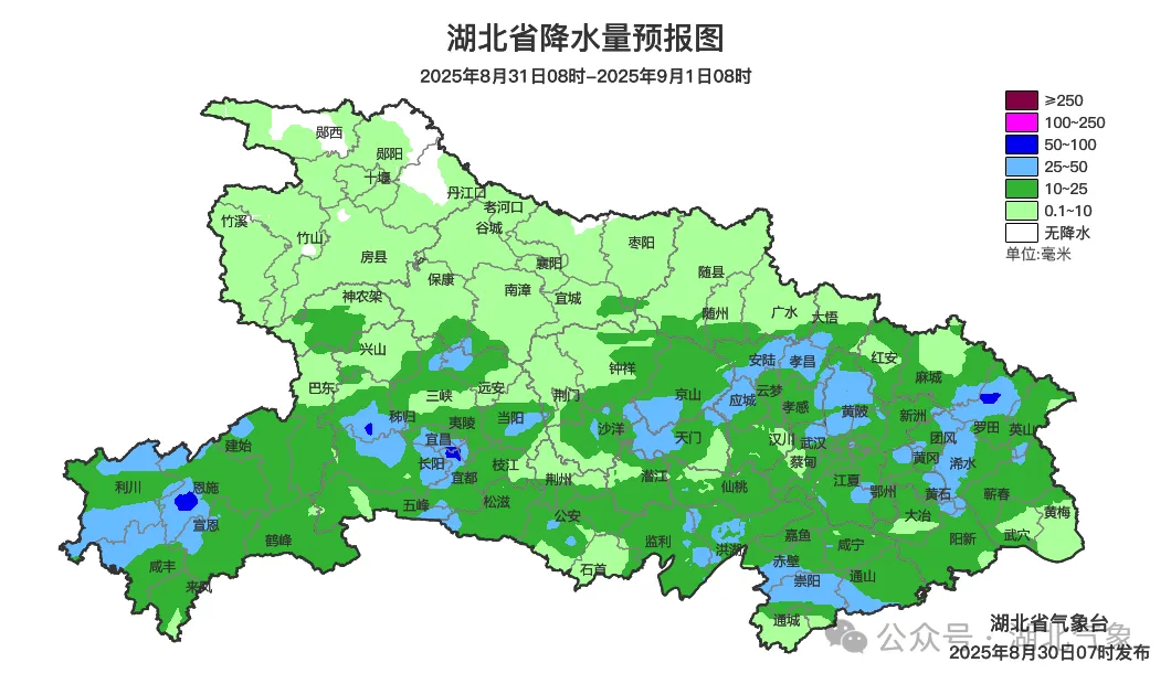2025年08月30日08时-2025年08月31日08时,预计三峡库区(兴山县北部、夷陵区中部和东部),神农架林区北部和中部、十堰(张湾区西部和东部、茅箭区北部、郧阳区中东部和南部、竹溪县南部、竹山县东北部和南部、房县北部和南部、丹江口市西南部)、襄阳(保康县南部)、宜昌(点军区西部、远安县北部和西北部、当阳市西部、长阳土家族自治县中部、五峰土家族自治县西部)、恩施(利川市北部和中东部、咸丰县南部、来凤县、宣恩县南部和东部)、随州(曾都区西南部、随县南部、广水市中部和西南部)、孝感(安陆市西北部)以及其他强降水区域发生崩塌、滑坡、泥石流的风险较高。请注意防范!