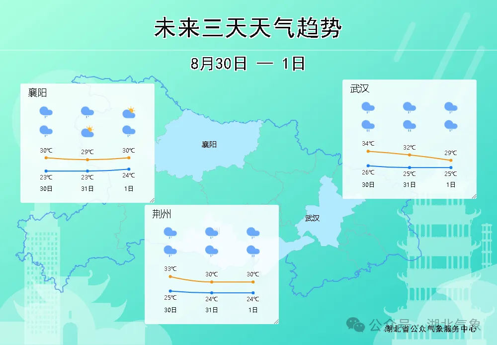 8月30日08时-31日08时,鄂西北、鄂西南、江汉平原、鄂东北多云转分散性中到大雨,局地暴雨;鄂东南多云到阴天有阵雨或雷阵雨。省内部分地区有短时强降水和雷暴大风。最高气温西部28~32℃、中东部32~35℃,最低气温西部21~24℃、中东部24~27℃,偏北风2到3级。