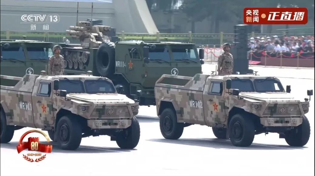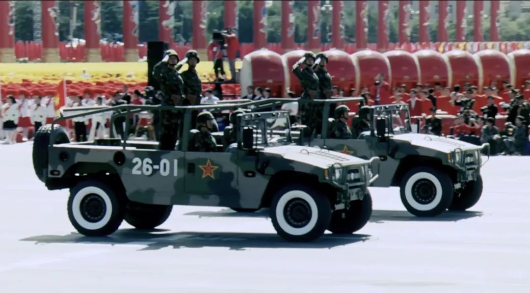 受阅的东风军车队伍中增添了新成员——40台东风“猛士”首次作为引导车出现在阅兵大典上,43台东风EQ2102系列军车则装备于受阅的通信方队、无人机方队和后勤方队。