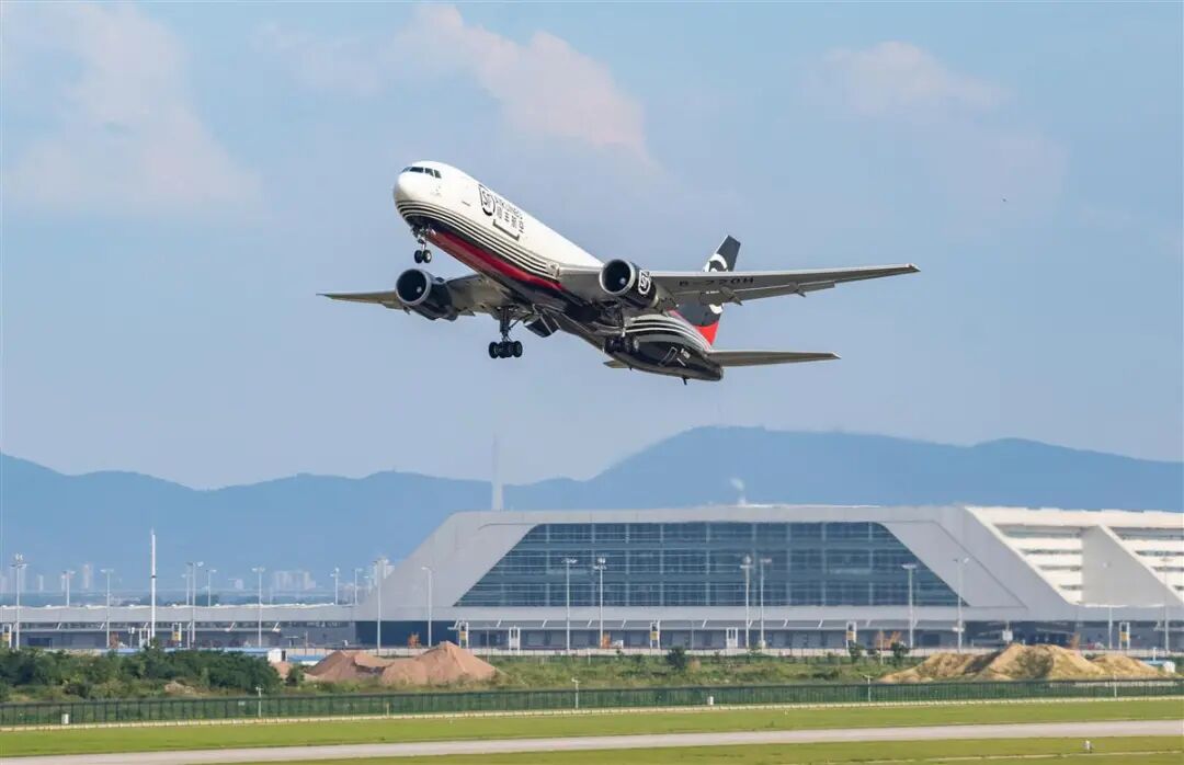 一架B767-300型全货机从鄂州花湖国际机场起飞,前往印度新德里。
