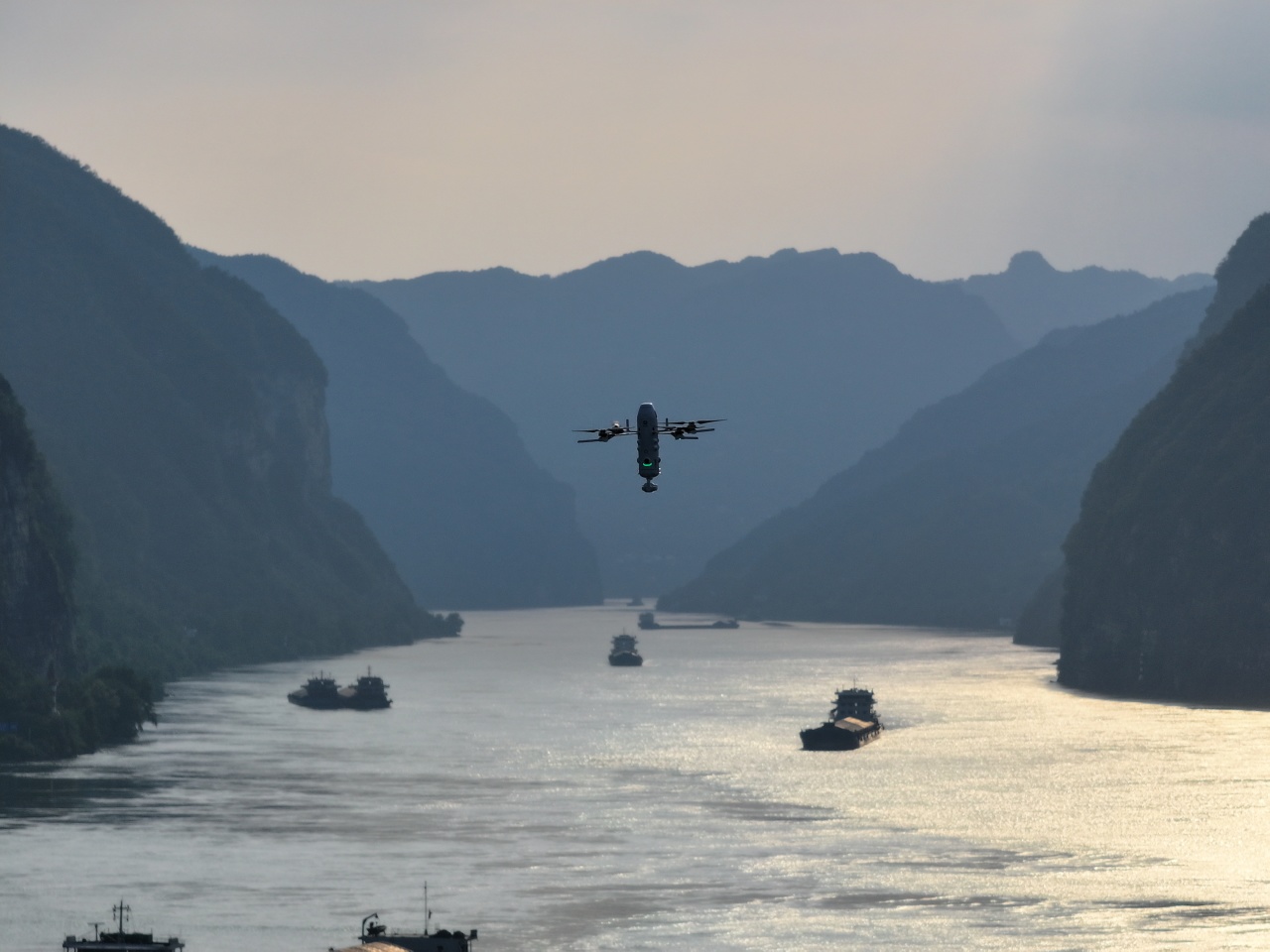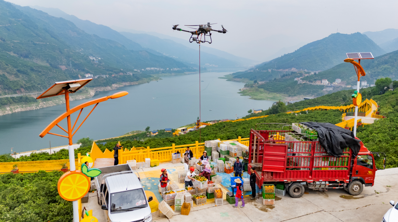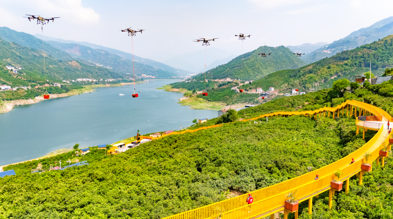 秭归县彭家坡村脐橙园上空,无人机编队来往穿梭,精准吊运轮晚脐橙。通讯员彭强 摄