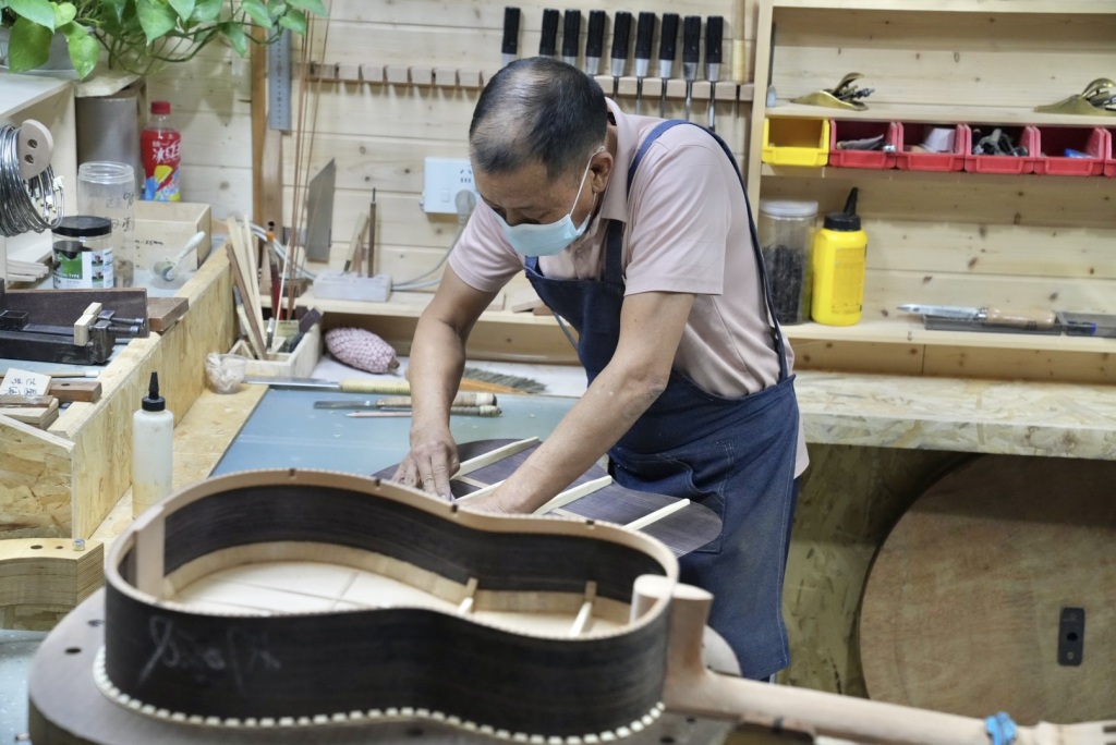 易平介绍,桐馨乐器的核心制作团队有百余人,骨干师傅多是20年以上从业经验,有的早年是木工出身,2000年前后转行制琴,从手工时代一路走到精密制造。现在,车间引入了数控设备,制琴师不仅会操作机器,还能编程、绘图,使吉他制作精度进一步提升。