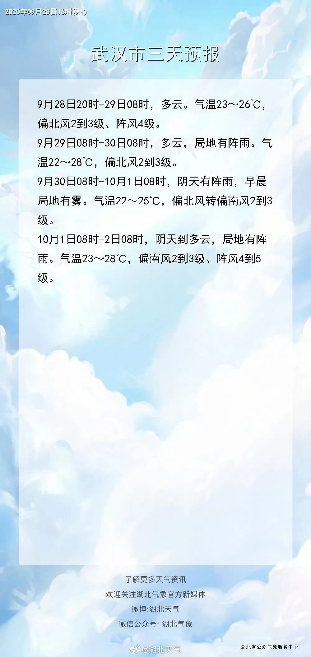 据武汉市气象台预报预计国庆中秋假期武汉市以多云天气为主气温总体适宜,利于出行其中9月30日至10月1日白天有弱降水10月2日至10月8日以多云天气为主其中10月2日、5日夜间有弱降水此外,10月6日至7日受地面较强冷空气南下影响有一次大风降温天气过程平均气温降幅7~9℃伴有3~4级偏北大风阵风5~7级据湖北省气象台预报今天夜间起新一轮降雨来袭鄂西北降雨频繁鄂东以阴天到多云为主其中今天夜间至9月29日鄂西有中到大雨十堰、襄阳部分地区有暴雨东部以多云到阴天为主局地有阵雨出没9月30日雨势减弱鄂西有小到中雨、局地大雨鄂东有分散性阵雨10月1日鄂西北及鄂东北西部有中到大雨、局地暴雨