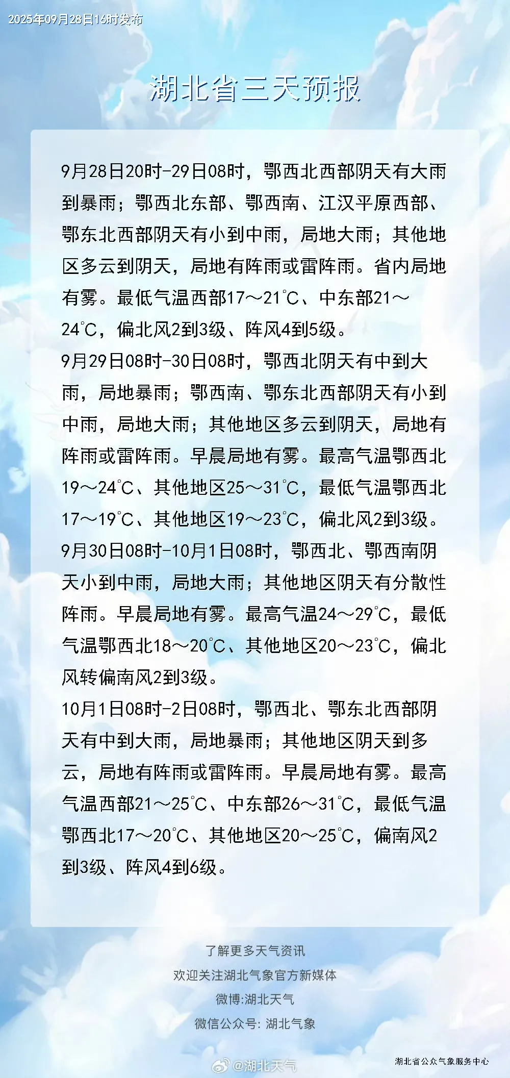 9月28日17时48分十堰市气象台发布暴雨黄色预警信号今天下午十堰市大部出现小到中雨雨量5~20毫米预计今天夜间到明天早晨十堰市降雨持续大部将出现大雨到暴雨山区山洪、地质灾害、城乡积涝风险较高请注意防范临近国庆中秋假期接下来湖北的天气如何?