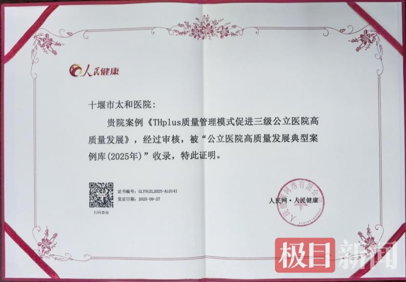 近日,在人民网主办的2025公立医院高质量发展总结交流会上,湖北十堰市太和医院报送的《TH plus质量管理模式促进三级公立医院高质量发展》案例,被评为“2025公立医院高质量发展典型案例”。这一荣誉标志着该院在医疗质量管理领域的创新实践获得国家级认可,也为公立医院高质量发展提供了“太和经验”。