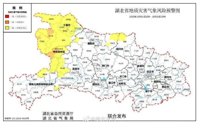 2025 年10 月01 日20 时-2025 年10 月02 日20 时,预计三峡库区(巴东县北部和中部、兴山县西部、秭归县大部),神农架林区大部、十堰(张湾区、茅箭区、十堰经济技术开发区、武当山特区、郧阳区、郧西县、竹溪县、竹山县、房县大部、丹江口市大部)、襄阳(谷城县西南部、枣阳市北部和西南部)、宜昌(长阳土家族自治县西北部、五峰土家族自治县西南部)、恩施(建始县北部)、随州(随县西北部)以及其他强降水区域发生崩塌、滑坡、泥石流的风险较高;其中,神农架林区西部和中北部、十堰(竹溪县中北部、竹山县中北部)发生崩塌、滑坡、泥石流风险高。请注意防范!