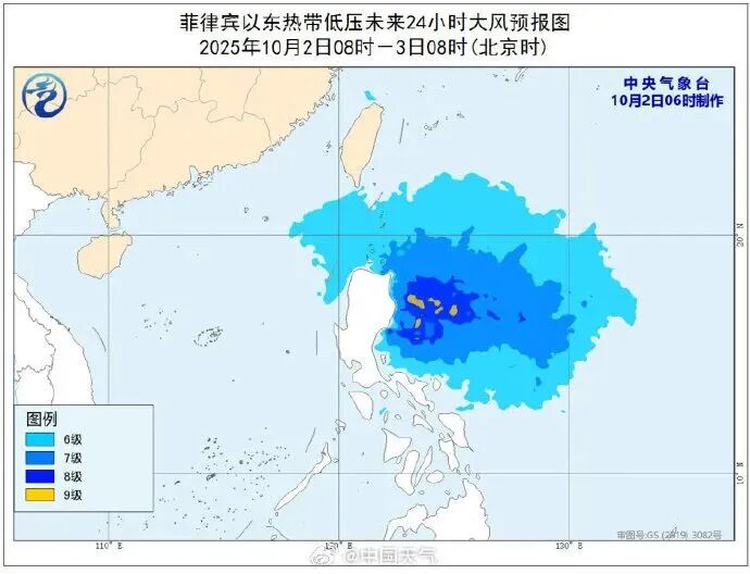大风预报:2日08时至3日08时,巴士海峡将有6-7级、阵风8级的大风。