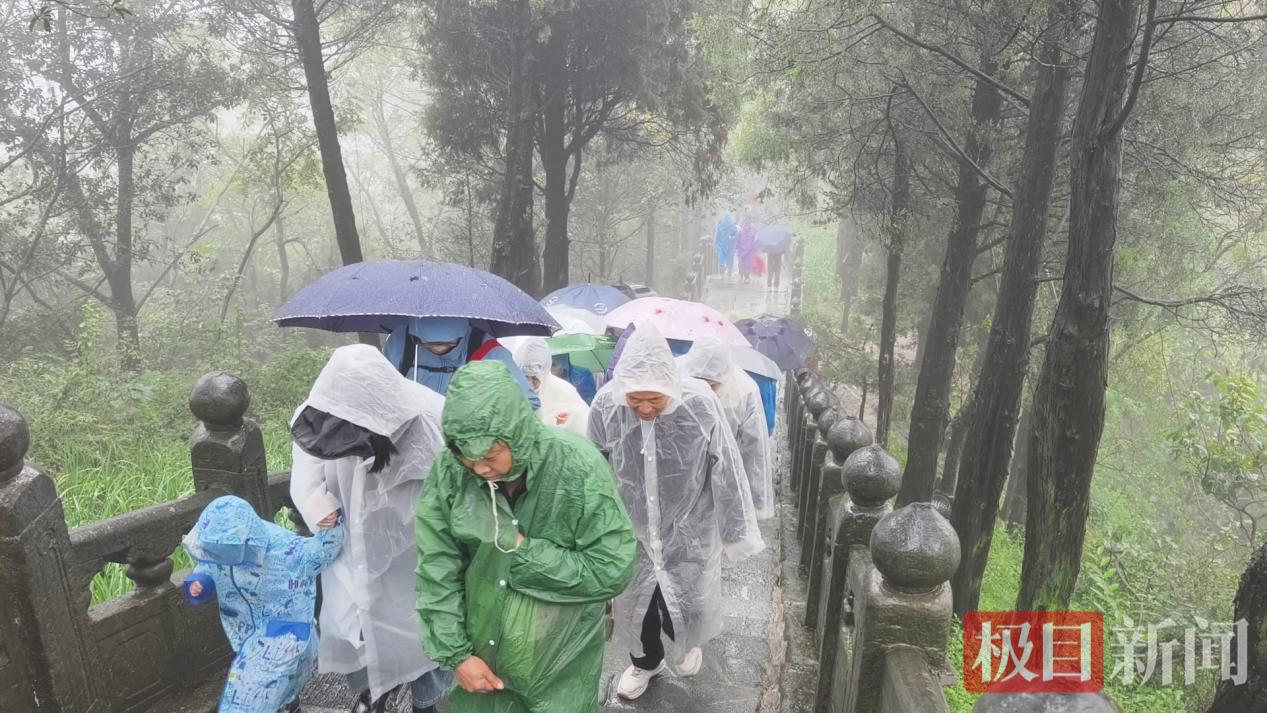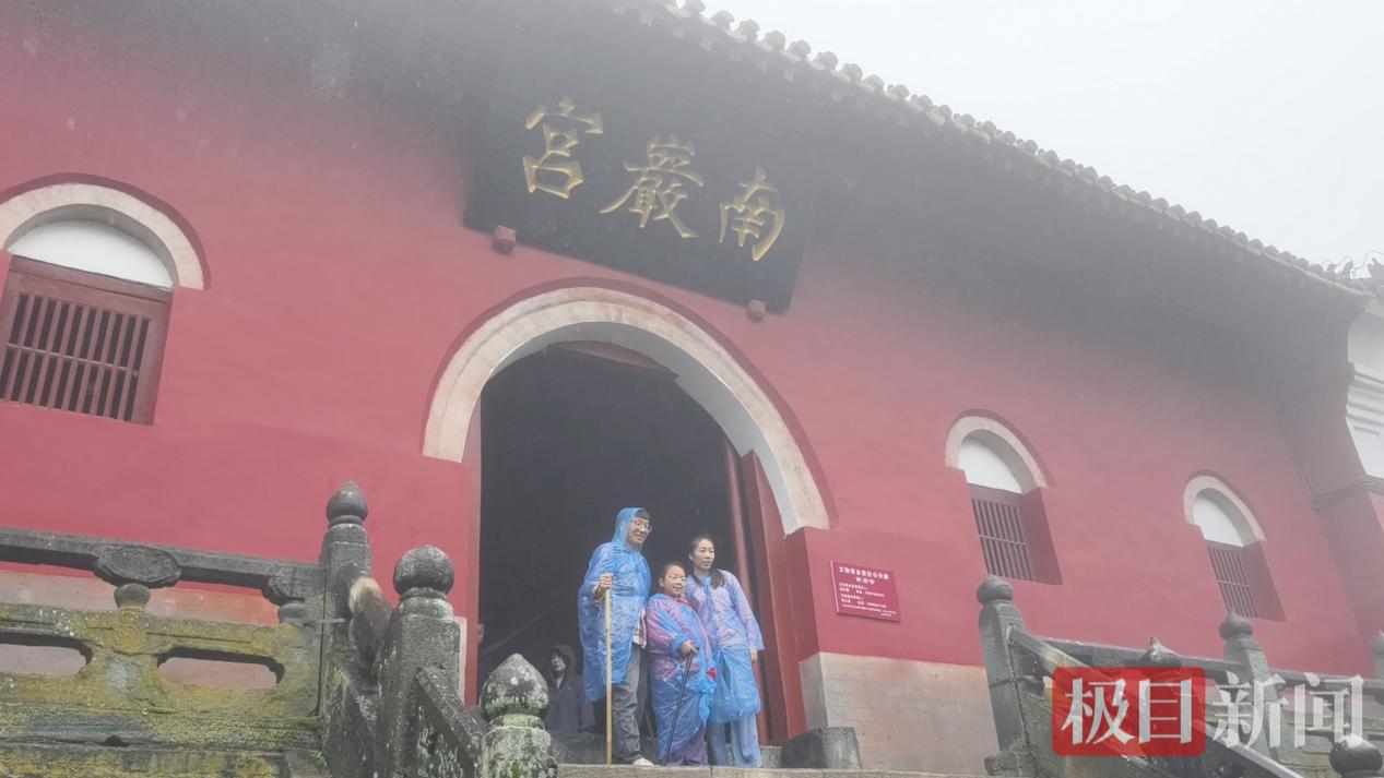 假期前几天,武当山笼罩在绵绵秋雨中。雨丝为红墙金瓦的宫观蒙上了一层诗意面纱,山林石阶间,游客们身着各色雨衣,撑伞漫步,宛若流动的色彩在水墨画卷中穿行。南岩宫前,雨雾让古老的建筑更显沧桑与静谧。