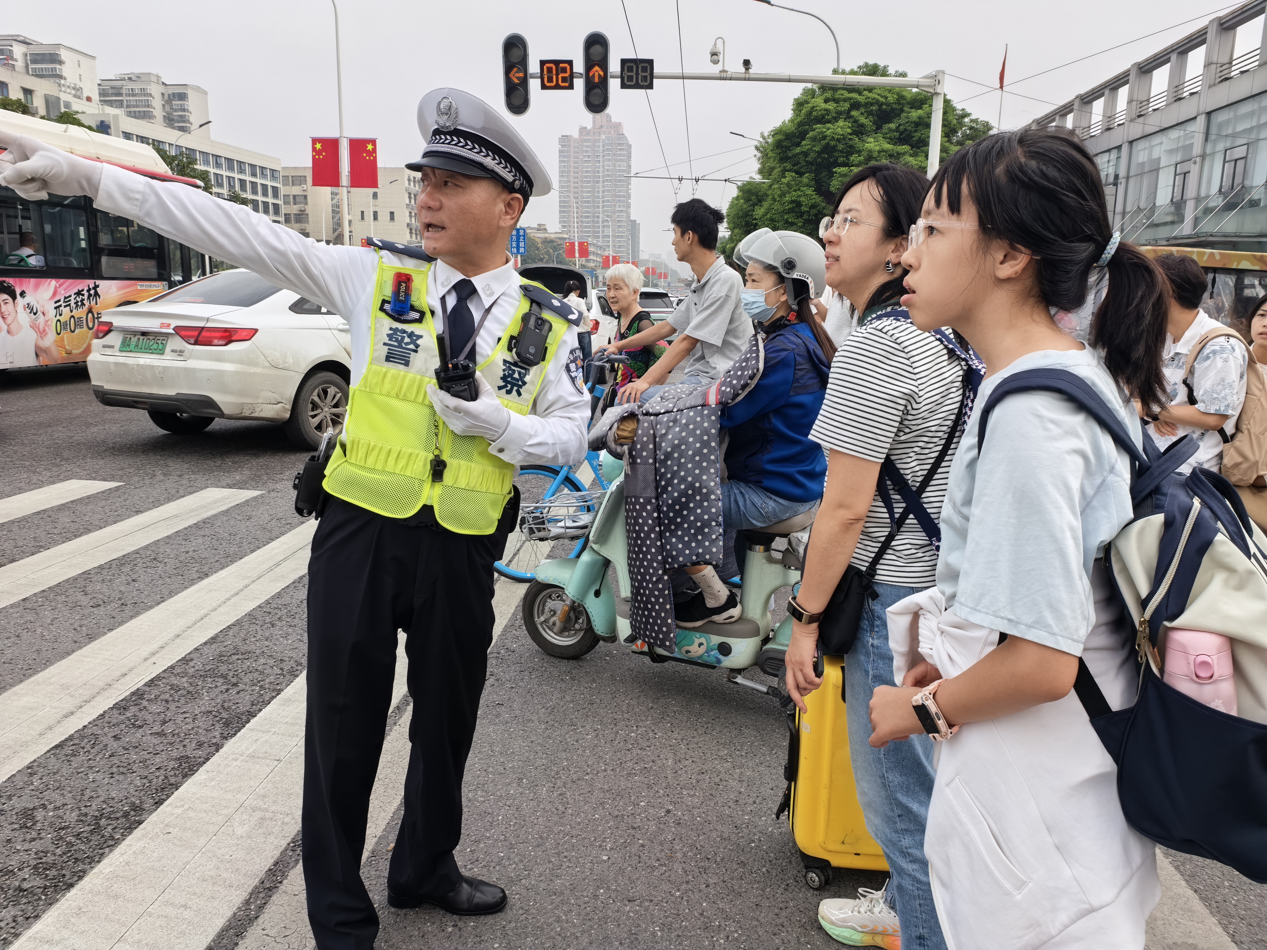 武汉交警刘五桥在武昌火车站周边为群众指路。 通讯员李佳 供图