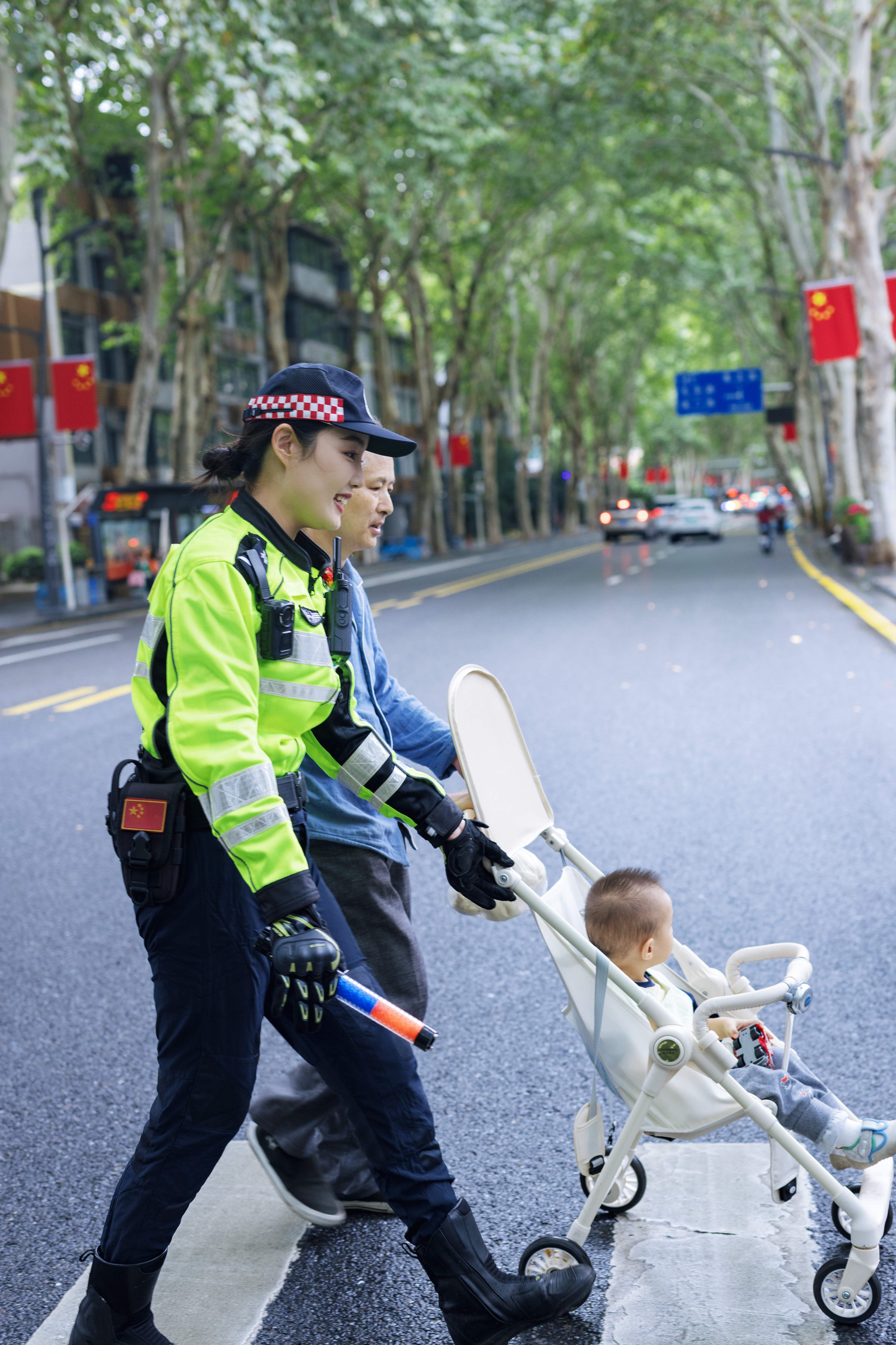 江岸交警江雅莉在街头保护孩子过马路。 通讯员李佳 供图