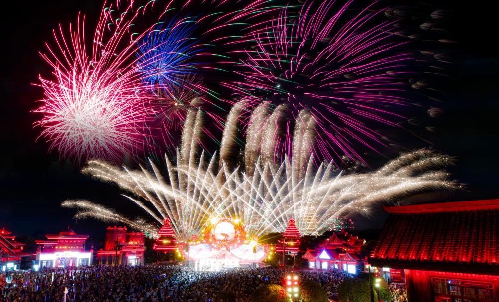 国庆中秋假期,荆州方特东方神画主题乐园举办烟火秀。新华社发