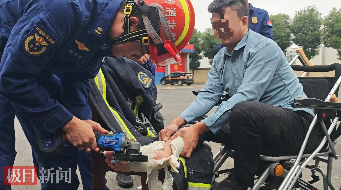 了解情况后,消防员迅速响应,在操作中充分考虑田先生腿部尚未完全康复的情况,谨慎选择适用工具,精准控制力度。最终,消防员成功地将“困”在田先生腿上的石膏板拆除,未造成二次伤害。