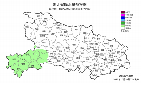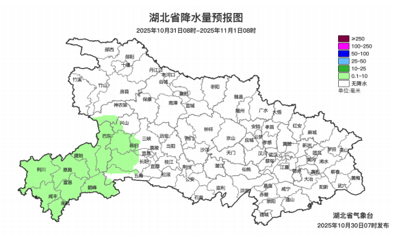 10月30日08时-31日08时,鄂西南南部、江汉平原南部零星小雨转多云;鄂东北东部、鄂东南小雨转多云;其他地区阴天到多云。夜间到早晨局地有雾。最高气温中西部21~25℃、东部18~21℃,最低气温10~14℃,偏北风2到3级。