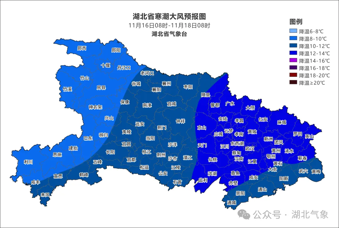 预计16日下午至17日,我省将有寒潮大风天气,大部分地区平均气温下降8~12℃,其中随州、荆门东部、荆州东部、天门、仙桃、武汉、孝感、黄冈、鄂州、咸宁等地下降12~14℃,19日凌晨全省最低气温降至-3~3℃;期间有偏北风4到6级、阵风7到9级;16日后半夜至17日白天,十堰、襄阳、神农架、恩施北部、宜昌等地山区有雨夹雪或雪(1200米以上高山区中到大雪)。建议加固临时搭建物、避免高空作业,防范对交通航运、设施农业、在田作物、人体健康等的不利影响。