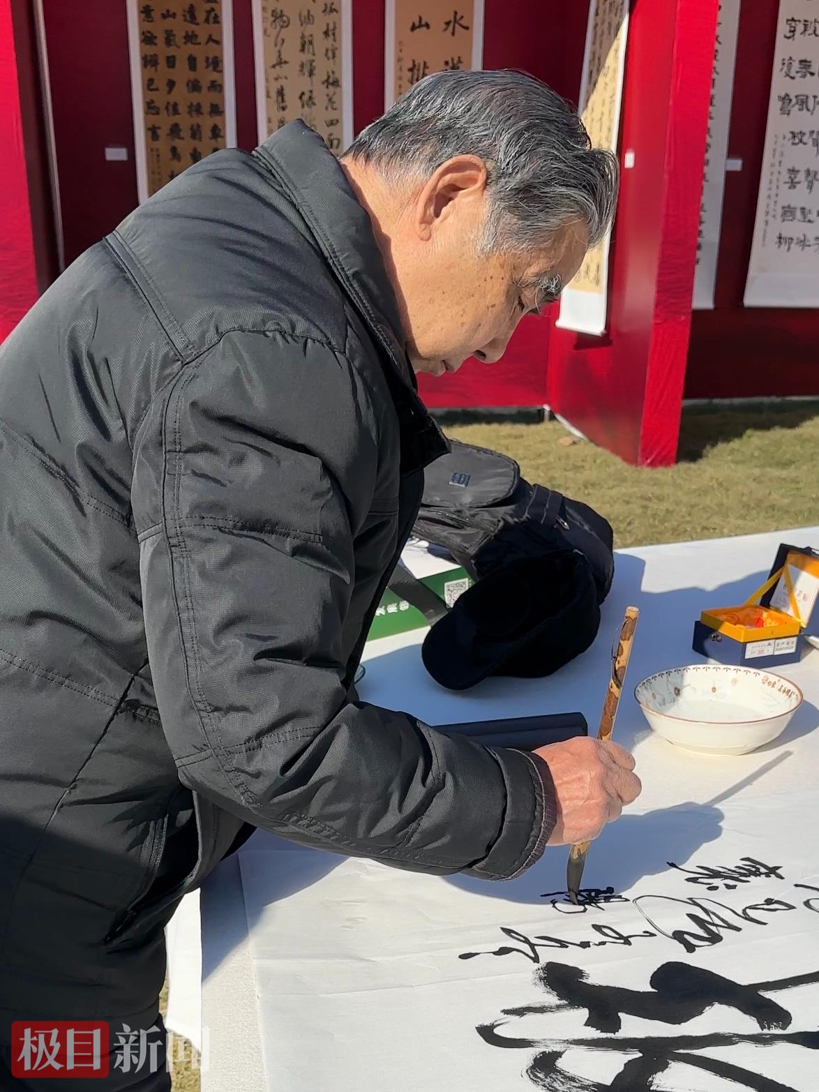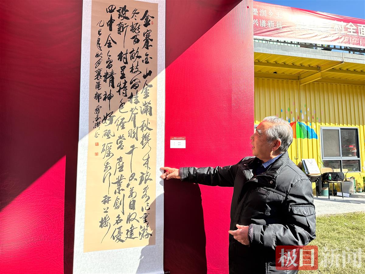 狼毫饱蘸浓墨,笔尖在宣纸上沉稳走笔,“村文样板”四个遒劲有力的大字一气呵成。年过七旬的郭家忠手持印章,在作品角落依次钤下三方朱红印记,随后与湖北襄阳市襄州区峪山镇大坡村村书记王佑林并肩而立,快门按下定格下这一画面。围观的书法爱好者见状纷纷上前,递上备好的宣纸,请他挥毫题字。11月19日上午,在襄州区峪山镇金寨村金寨田园“全国书法篆刻主题作品巡展暨乡村书法潮”活动现场,墨香伴着笑语暖意融融。