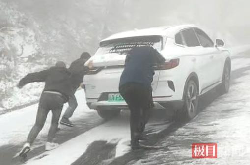 当日下午2时30分左右,一行人返程途中,山区突然遭遇降雪,“当时智能手表显示气温零下7℃,雪花落地就结冰,路面滑得根本站不住脚。”张女士回忆,当时雪花漫天飞舞且风势猛烈,路面湿滑如镜。据当日天气预报显示,随州市有寒潮天气并伴有降水,部分地区有雨夹雪,气温持续下降。张女士车辆行驶至一处陡坡时,因两驱电车抓地力不足,完全无法前行,只能停靠路边。