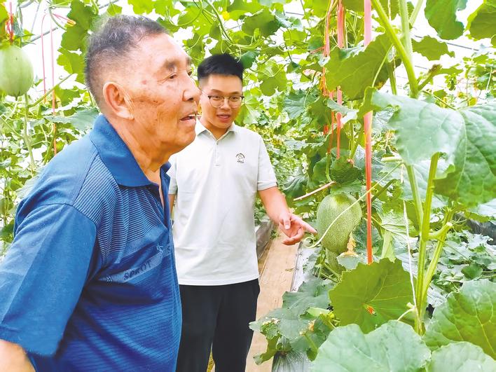 今年7月,罗官章(左)在大棚查看作物长势。(受访者供图)