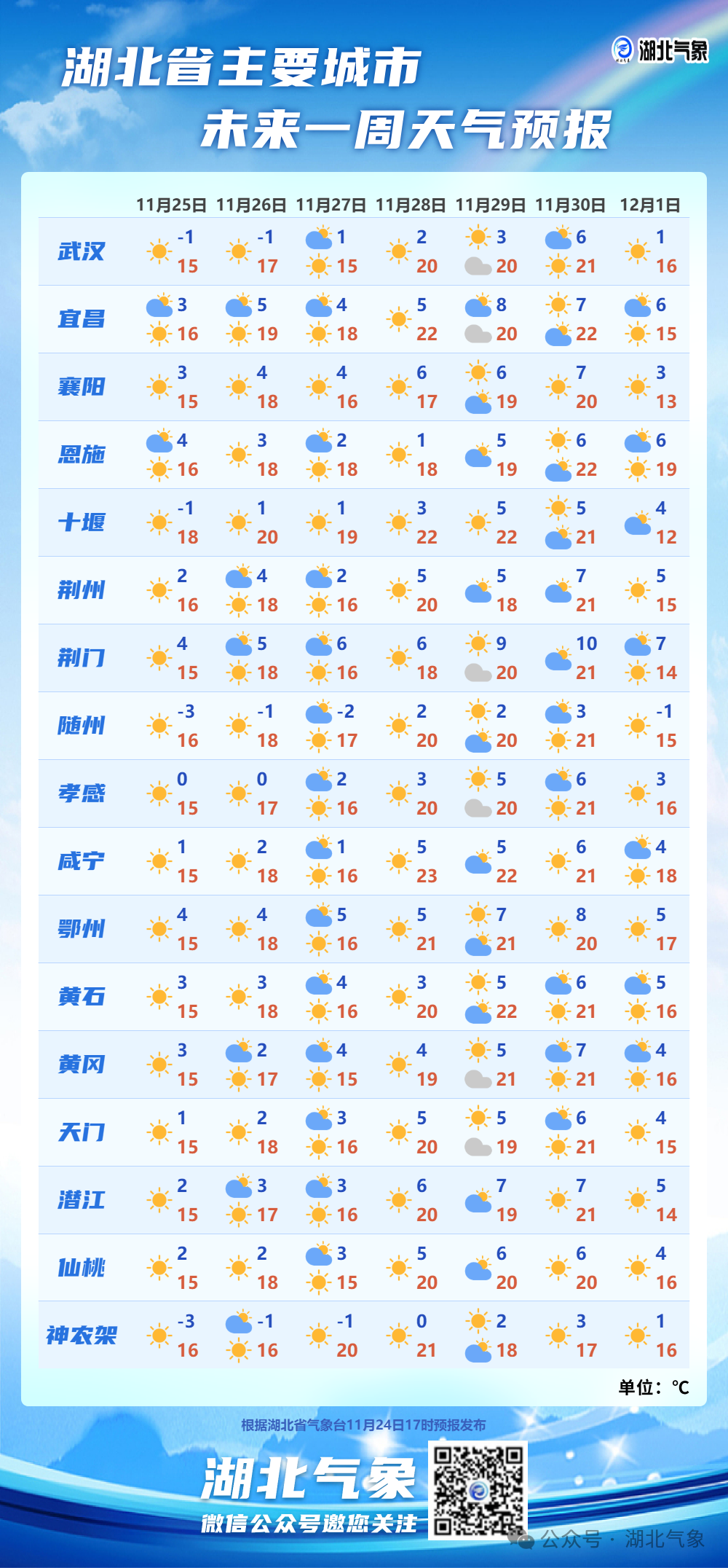 11月26日08时-27日08时,全省多云,其中神农架地区有零星雨夹雪。最高气温16~20℃,最低气温北部-3~1℃、南部1~5℃,偏南风2到3级转偏北风3到4级、阵风5到7级。