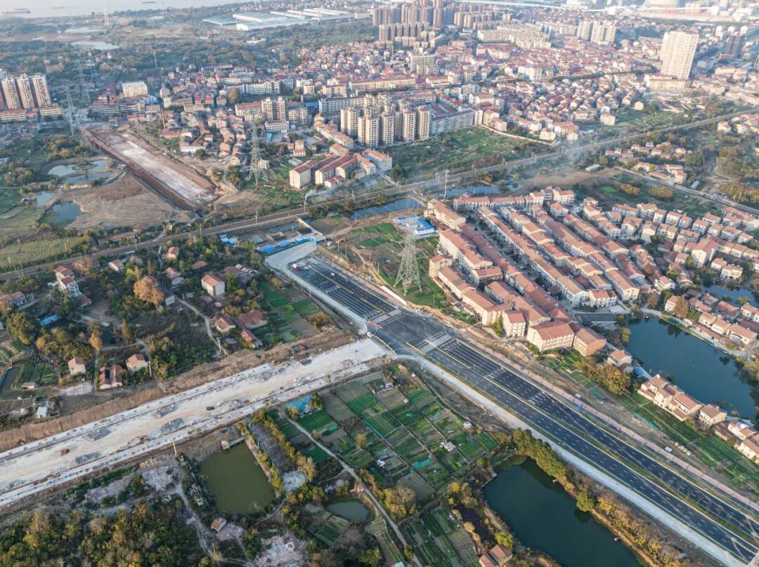 冬日的暖阳下,建设中的葛店大道一幅井然有序的繁忙景象。