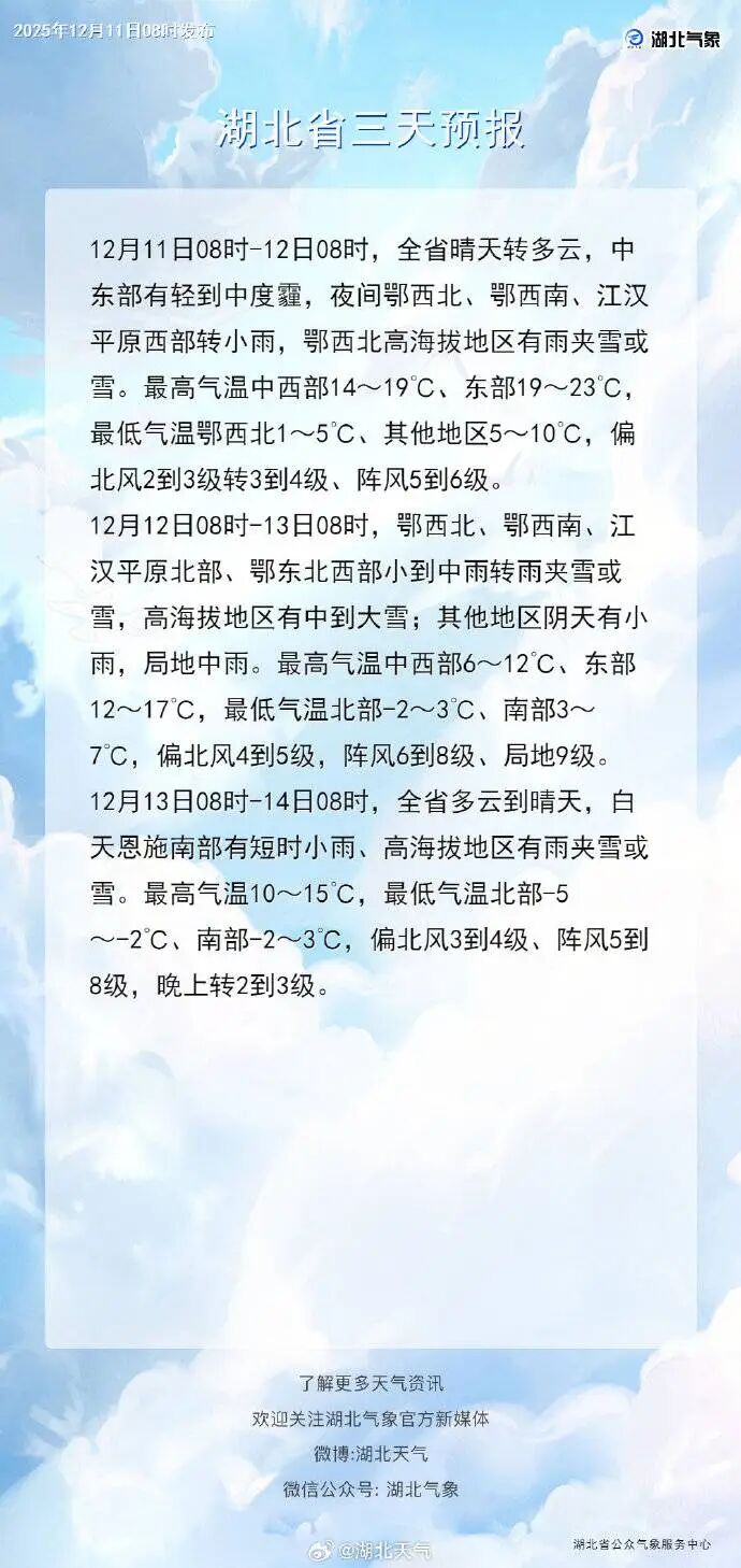 12月11日,湖北省防灾减灾救灾委员会办公室、省应急管理厅发布最新自然灾害风险提示,依据最新气象预报,12日至13日,湖北将出现明显降温、大风和雨雪天气,多地气温将“断崖式”下跌,北部最低气温降至-5℃,阵风可达7-10级;十堰、襄阳、神农架、恩施北部、宜昌西部等山区将出现中到大雪,积雪深度可达4-8厘米。