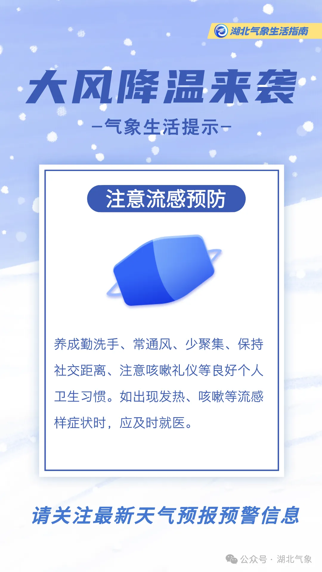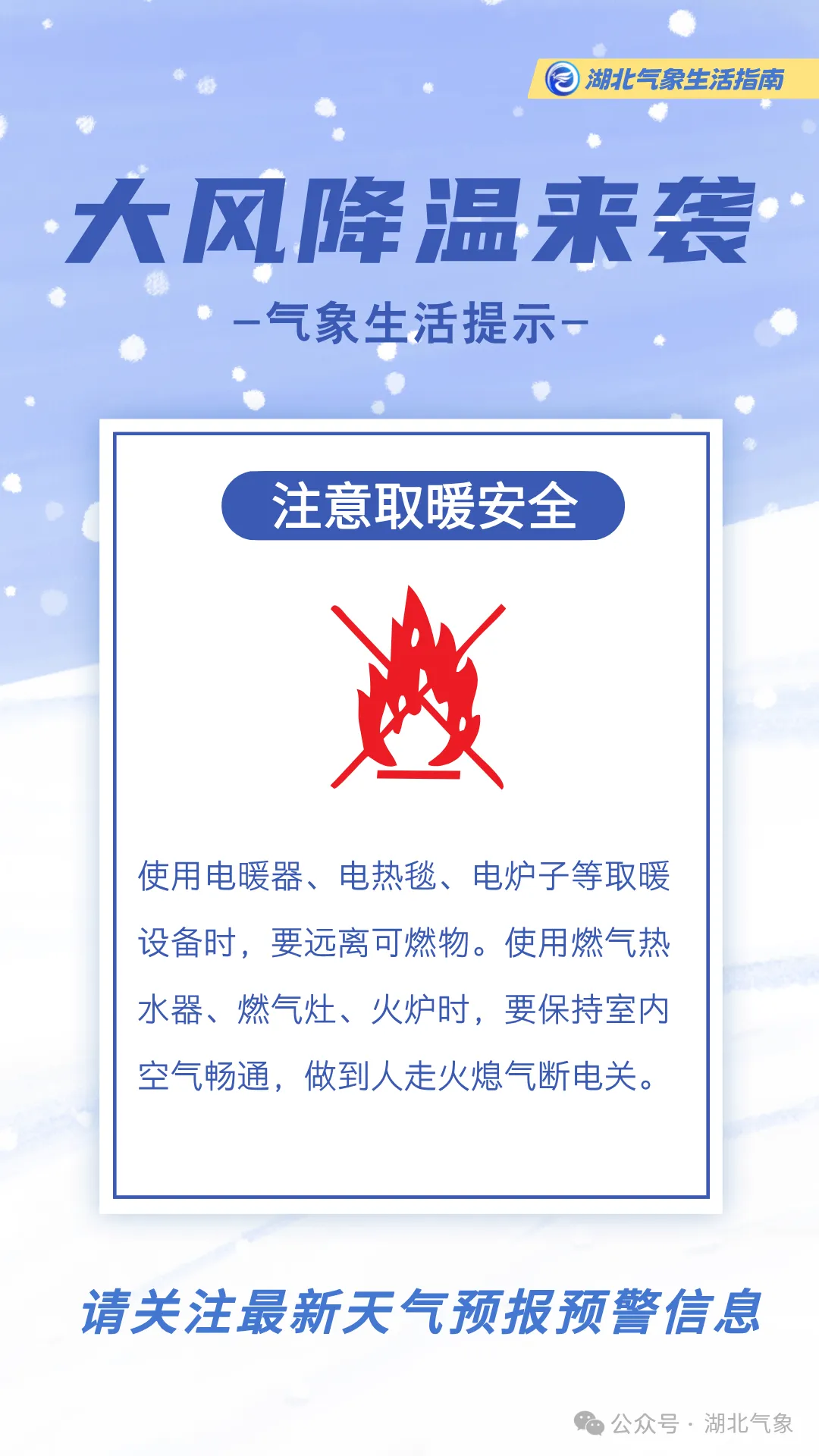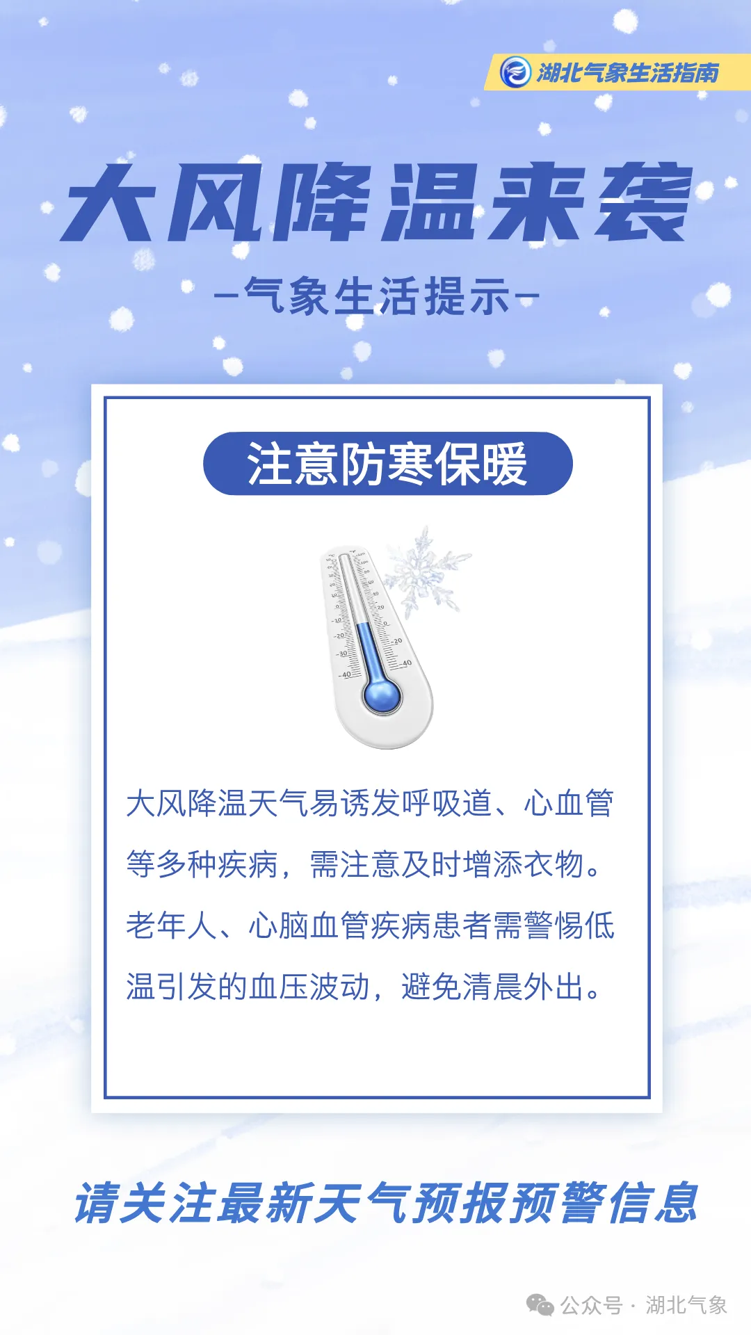 提醒公众此轮寒潮天气携大风雨雪来袭,请关注天气预警预报,提前安排出行,注意交通安全。同时,湖北大部将迎大幅降温,未来三天早晨最低气温普遍在冰点以下,需及时添加衣物,谨防感冒等呼吸系统疾病。大风时段应远离广告牌和临时搭建物等,谨防高空坠物。