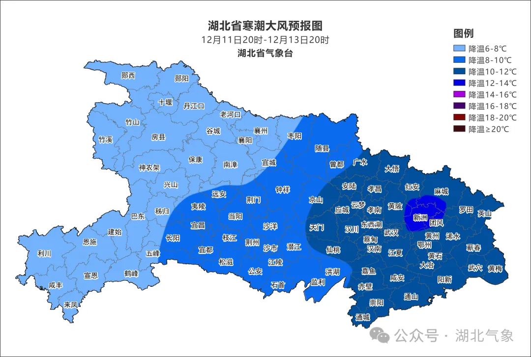 预计12日至13日白天,我省将有寒潮大风天气,大部地区平均气温下降 6~11℃,其中宜昌东部、随州、荆门、 荆州、孝感、武汉、仙桃、天门、潜江、鄂州、黄冈、黄石、咸宁下降8~11℃,14日早晨最低气温北部-5~-2℃,南部-2~3℃;期间有偏北风4~5级,阵风6~9级;12日十堰、襄阳、神农架、恩施北部、宜昌西部高海拔地区有中到大雪。