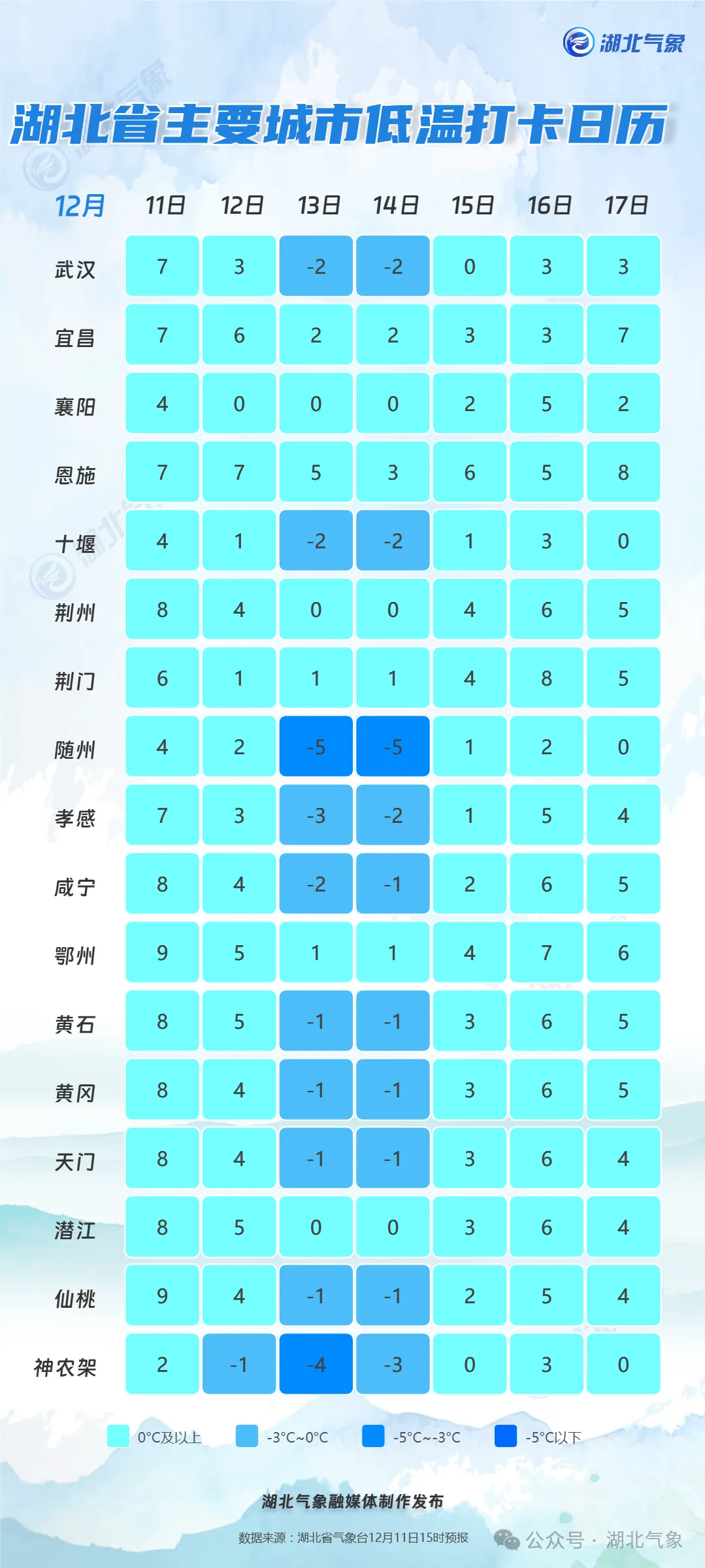 12月11日20时-12日08时,鄂西北、鄂西南、江汉平原西部多云转小雨,鄂西北高海拔地区有雨夹雪或雪;其他地区多云。最低气温鄂西北1~5℃、其他地区5~10℃,偏北风2到3级转3到4级、阵风5到6级。
