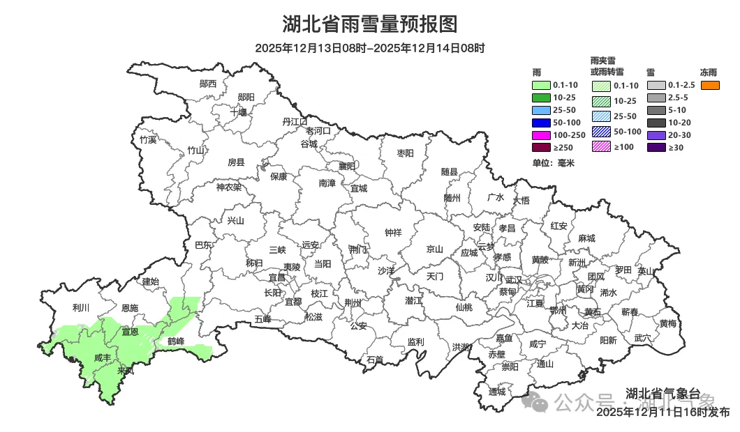 12月12日08时-13日08时,鄂西北、鄂西南、江汉平原北部、鄂东北西部小到中雨转雨夹雪或雪,高海拔地区有中到大雪;其他地区阴天有小雨,局地中雨。最高气温中西部6~12℃、东部12~17℃,最低气温北部-2~3℃、南部3~7℃,偏北风4到5级,阵风6到9级。