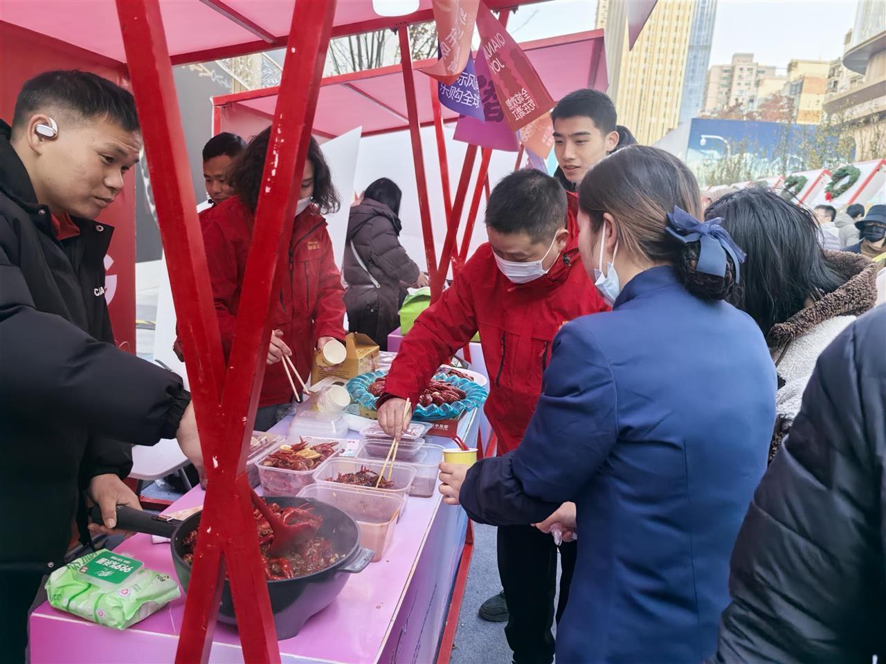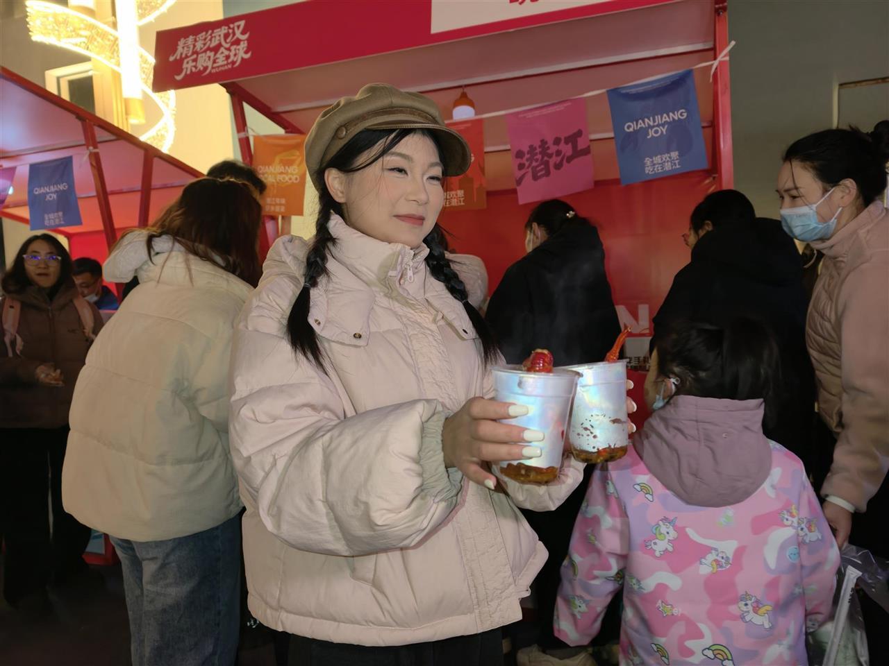 活动当日,活动现场的潜江龙虾主题展区也是人头攒动,潜江农发、晓飞歌等企业集中展示展销重点产品,鲜活虾、调味虾、虾调料等产品琳琅满目,展现了潜江全产业链实力。工作人员一边给市民递上试吃装,一边笑着介绍:“潜江龙虾不止夏天有,冬虾也很肥美!”