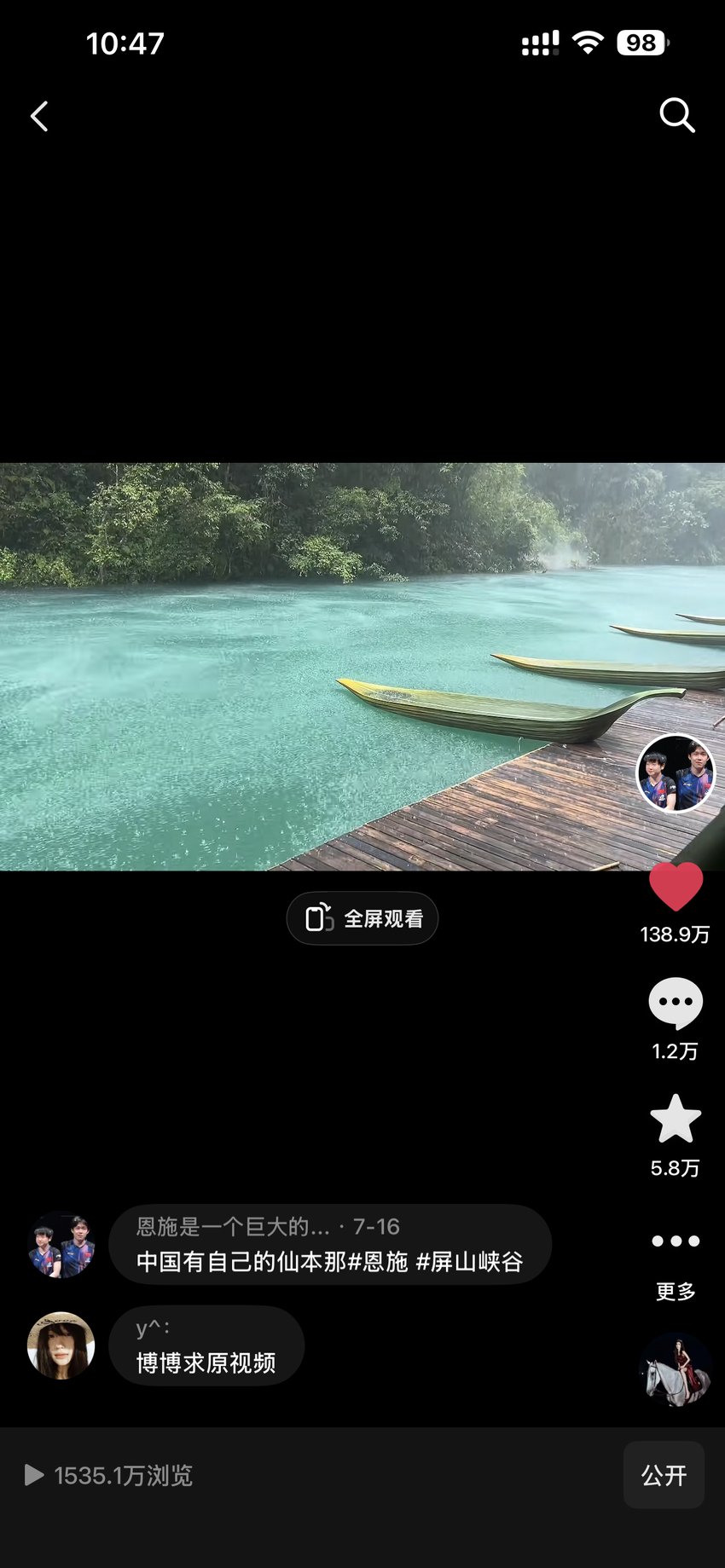 湖北日报客户端讯(通讯员丁慧玲)一位到鹤峰屏山旅游景区的游客,随手拍了一段10秒的短视频,在抖音上获得1535.1万次浏览量、138.9万点赞、28万次转发、收藏。12月16日,短视频拍摄者徐婷接受采访时说,被“中国最美水域”屏山随手拍的惊天流量所折服。