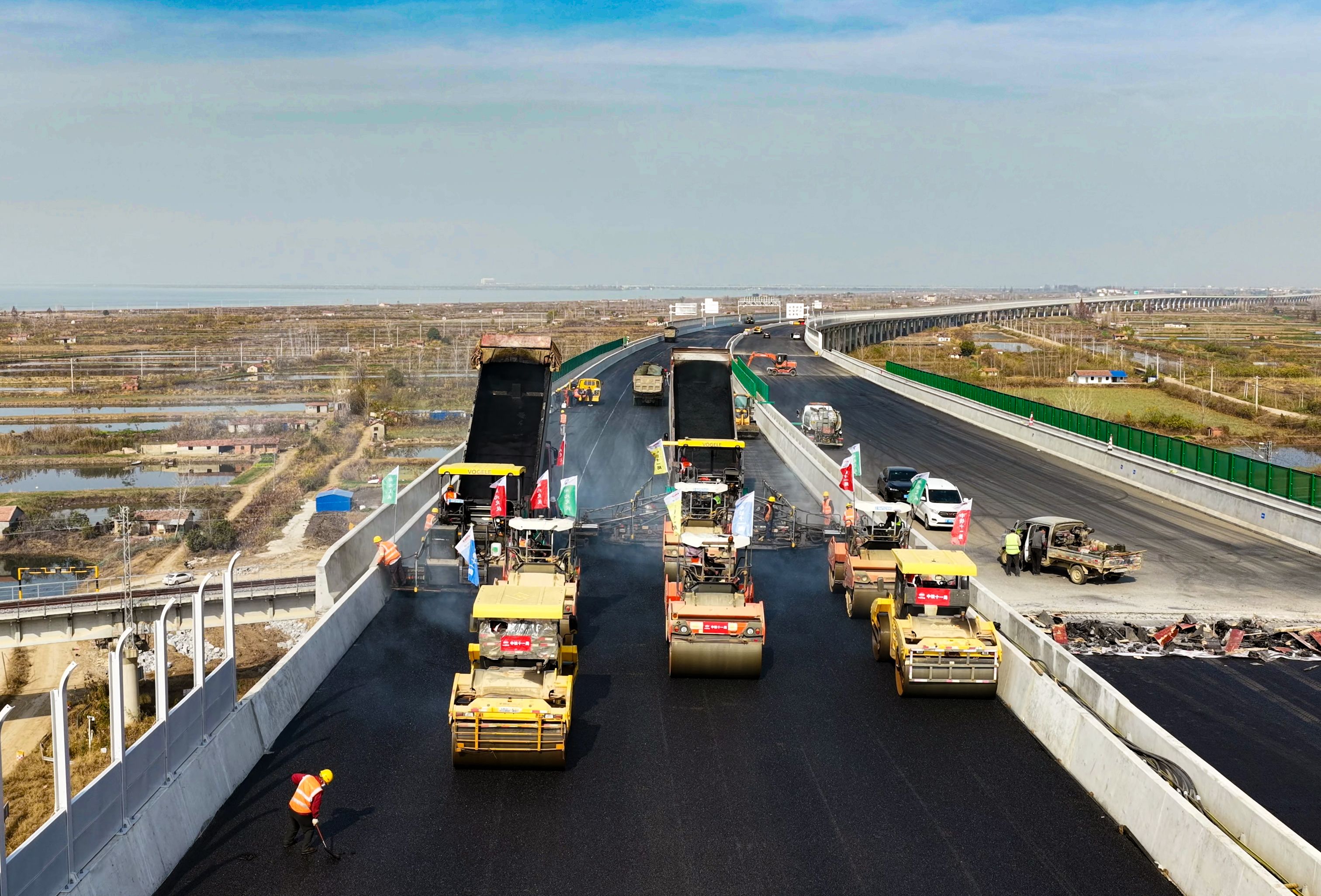 12月16日,长江日报记者来到由湖北交投投资建设、中铁十一局参与施工的新港高速公路(双柳长江大桥及其连接线工程)施工现场时看到,随着最后一车沥青混合料铺好、压平,武汉新港高速公路沥青摊铺施工结束,这标志着整个项目进入了通车前的最后冲刺阶段。