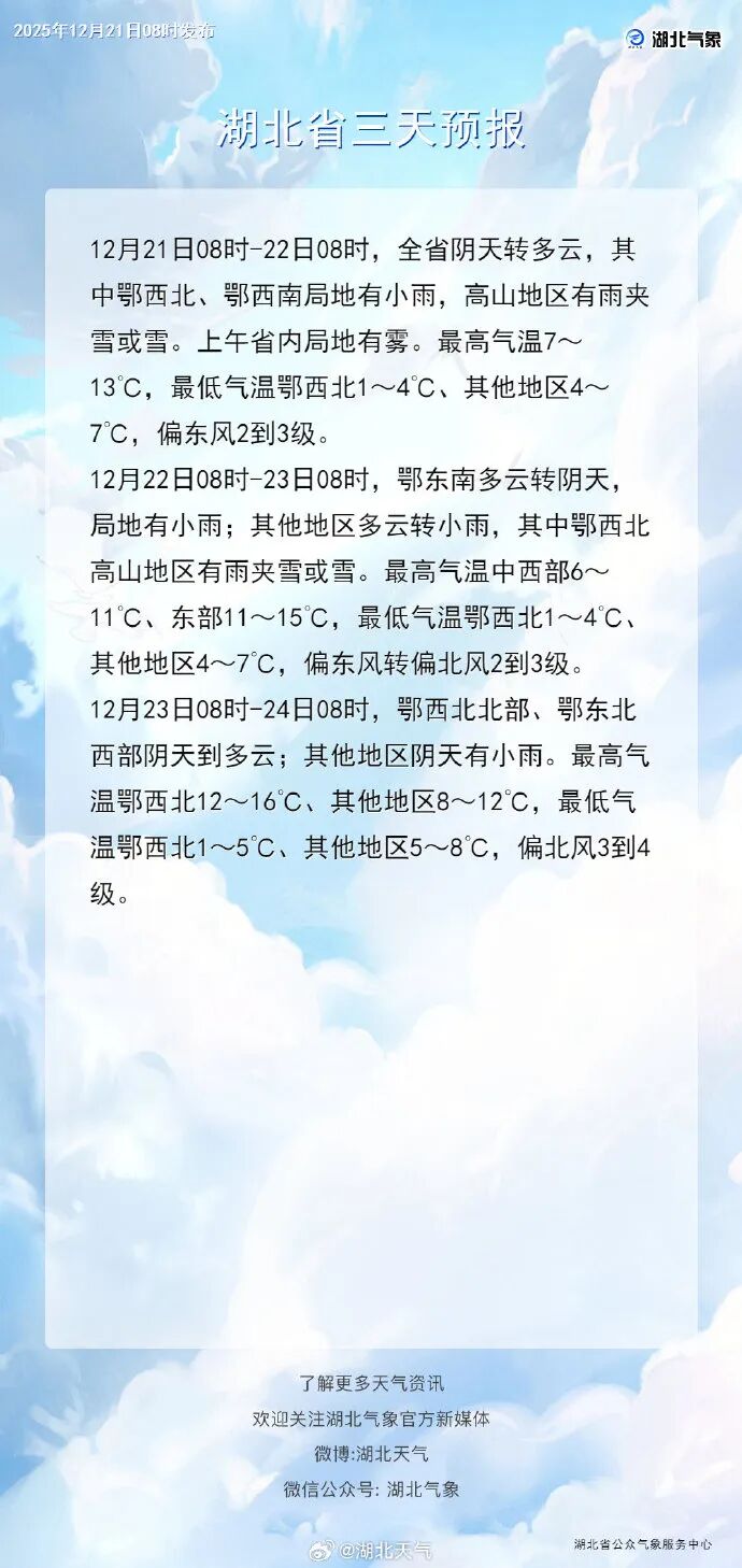 值得一提的是,湖北又要下雪啦!预计今天,大部地区阴天转多云,其中西部局地有小雨,高山地区有雨夹雪或雪,最高气温进一步降至7~13℃。22日晚上至24日,湖北大部地区小雨,西部高山区有雨夹雪或小到中雪。最高气温7至14℃,最低气温3至7℃,阵风4到6级。