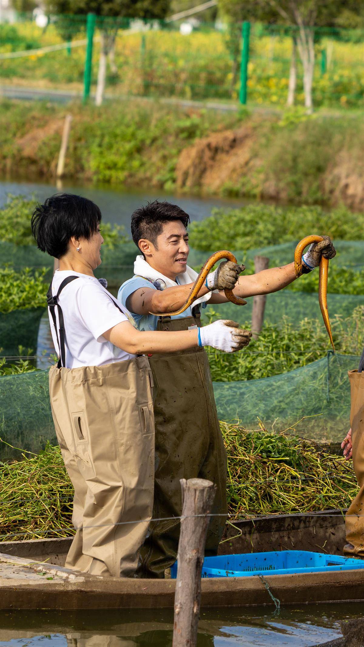 2025年8月21日,央视一套《山水间的家》第四季走进张沟镇先锋村,主持人撒贝宁、演员凯丽及作家、故宫文化传播研究所所长”沉浸式打卡“中国网箱养鳝第一村”。通讯员 吴晴霄 摄