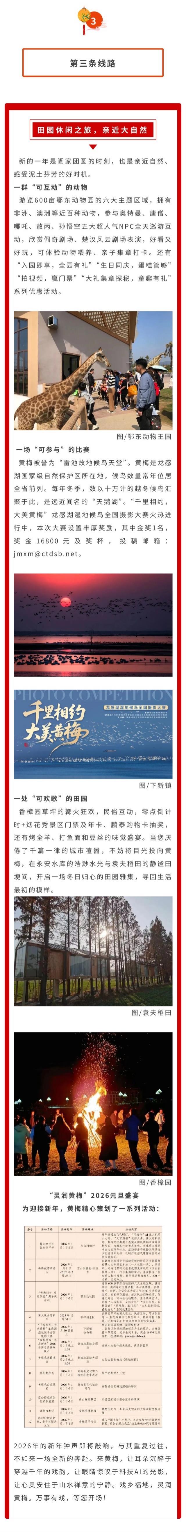 当一曲黄梅调响起,2026年的元旦,一场穿越古今的非遗之旅,正在“戏乡福地·灵润黄梅”盛大开启。这里不仅是黄梅戏的故乡,禅宗的发祥地,更是非遗体验之地。湖北黄梅县诚挚邀请你来黄梅跨年,一定有戏!该县推出三条旅游线路,总有一条适合你。值得一提的是,“千里相约,大美黄梅”龙感湖湿地候鸟全国摄影大赛火热进行中,本次大赛设置丰厚奖励,其中金奖1名,奖金16800元及奖杯,投稿邮箱:jmxm@ctdsb.net。