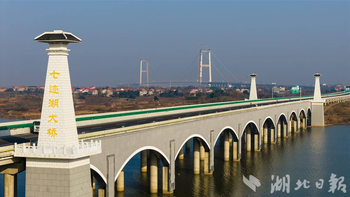 小心翼翼打桩架梁,按下静音键施工。由于横跨长江中游生态敏感区,毗邻涨渡湖湿地保护区,大桥建设者始终将生态保护置于首位。双柳长江大桥项目创新提出“生态优先、低碳循环、智能管控”三位一体绿色建造理念,实现了工程建设与生态保护的深度融合。主桥采用一跨过江设计,水中不设桥墩,最大限度减少对水生生物的干扰。在生态敏感路段“舍近求远”,通过生态适配模型科学优化桥位,特地为涨渡湖湿地“让”出一公里。创新应用桩基泥浆循环利用与压滤固化“零排放”工艺,从源头控制污染。严格落实生态修复,对临时用地、边坡等进行覆土复绿,复绿面积达120.13公顷。项目还设置了桥面径流三级智能收集与处理系统,严防运营期路面污染物入江。