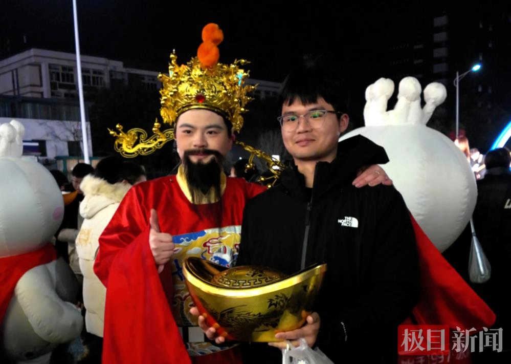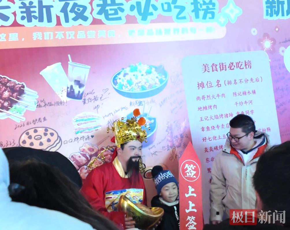 2026元旦假期,好运满分美食消费折扣券大派送广受欢迎,“财神爷”持元宝、宝箱美食券在街区巡游,与游客进行互动和福利发放。
