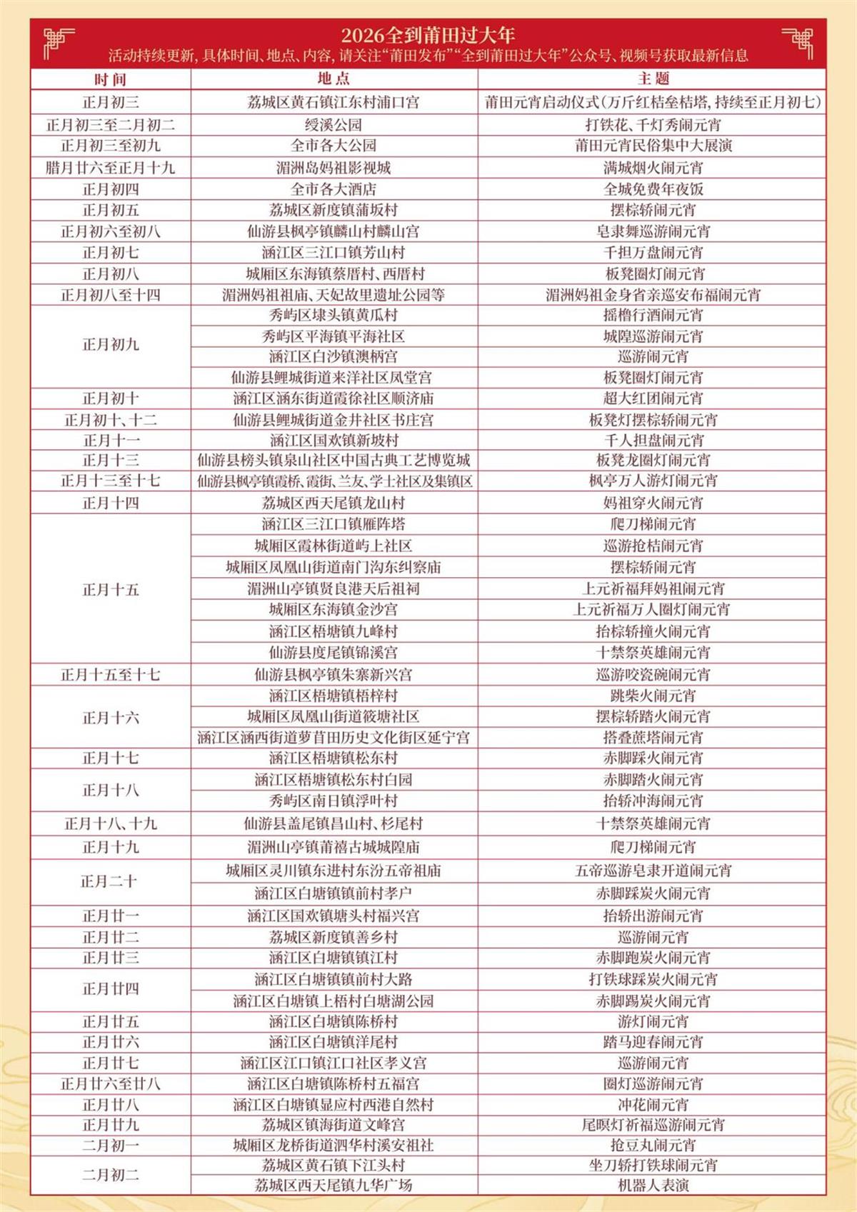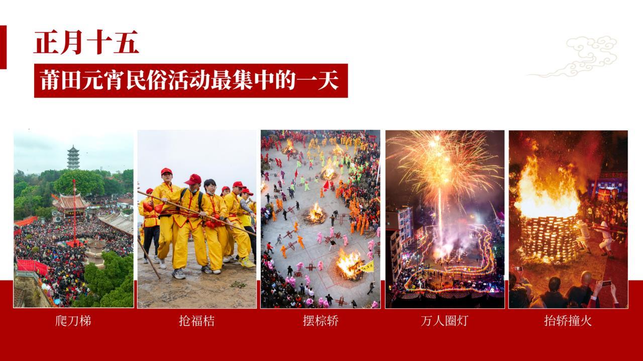 从农历正月初三至二月初二,莆田元宵持续一月欢腾,万斤红桔垒桔塔、全城免费年夜饭、万人游灯、打铁花、摆棕轿、爬刀梯、妈祖金身巡安布福等特色民俗活动轮番上演,天天有节目、家家齐上阵,精彩纷呈。