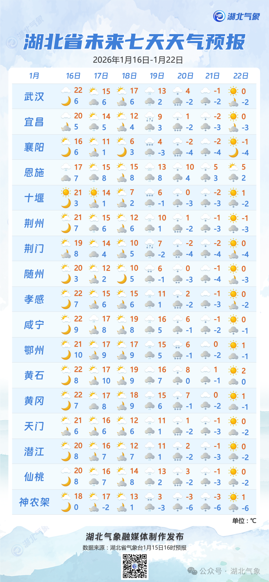 预报来源:湖北省气象台2026年1月15日16时预报