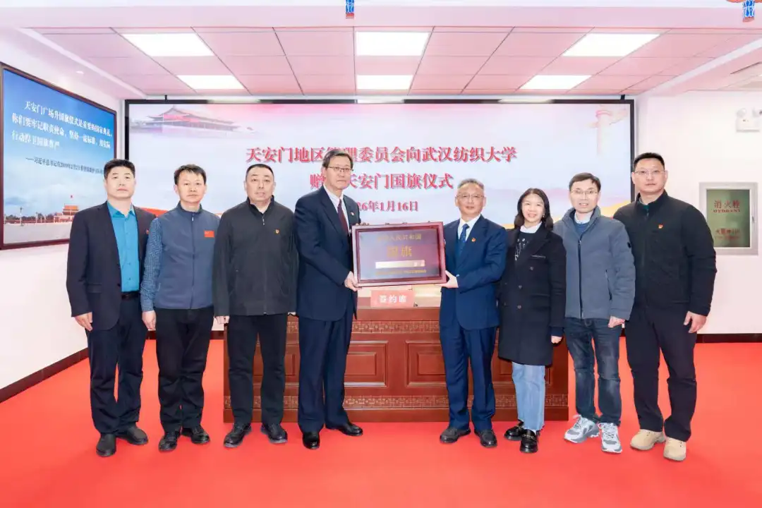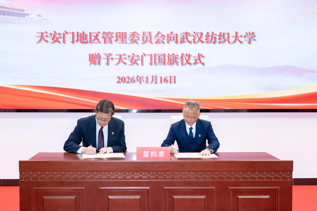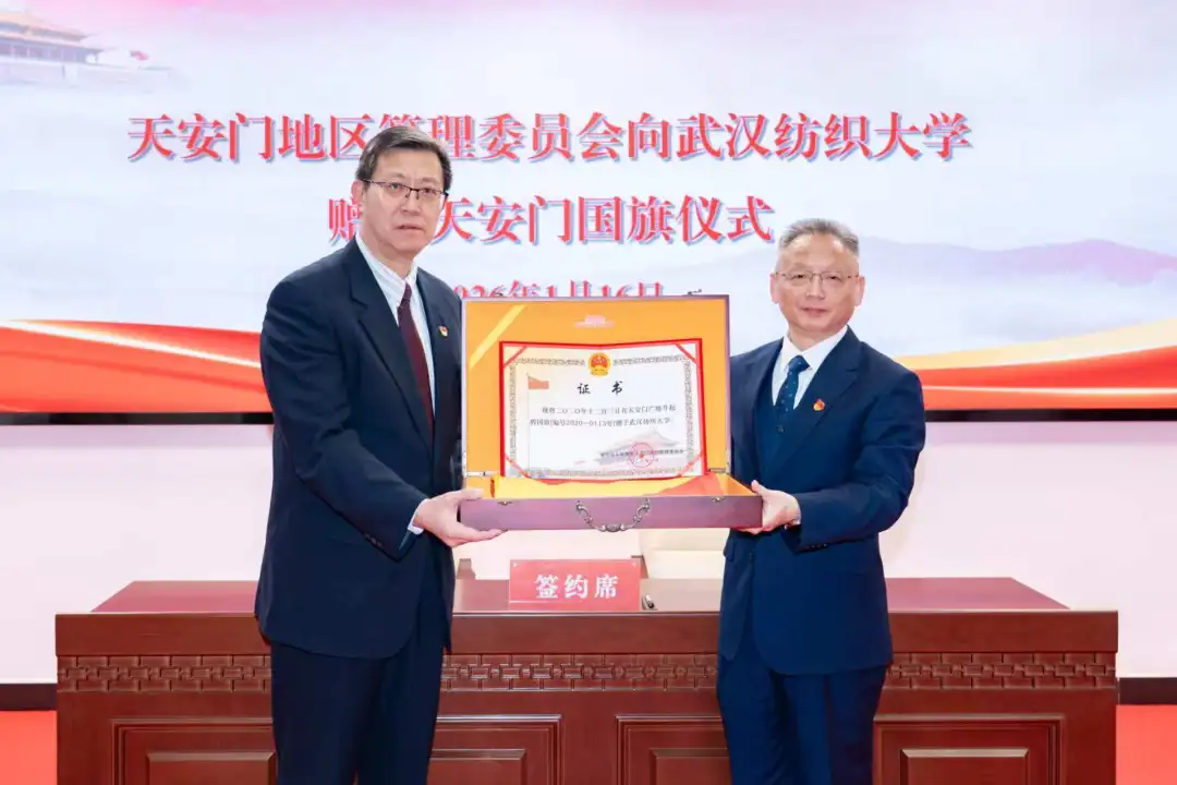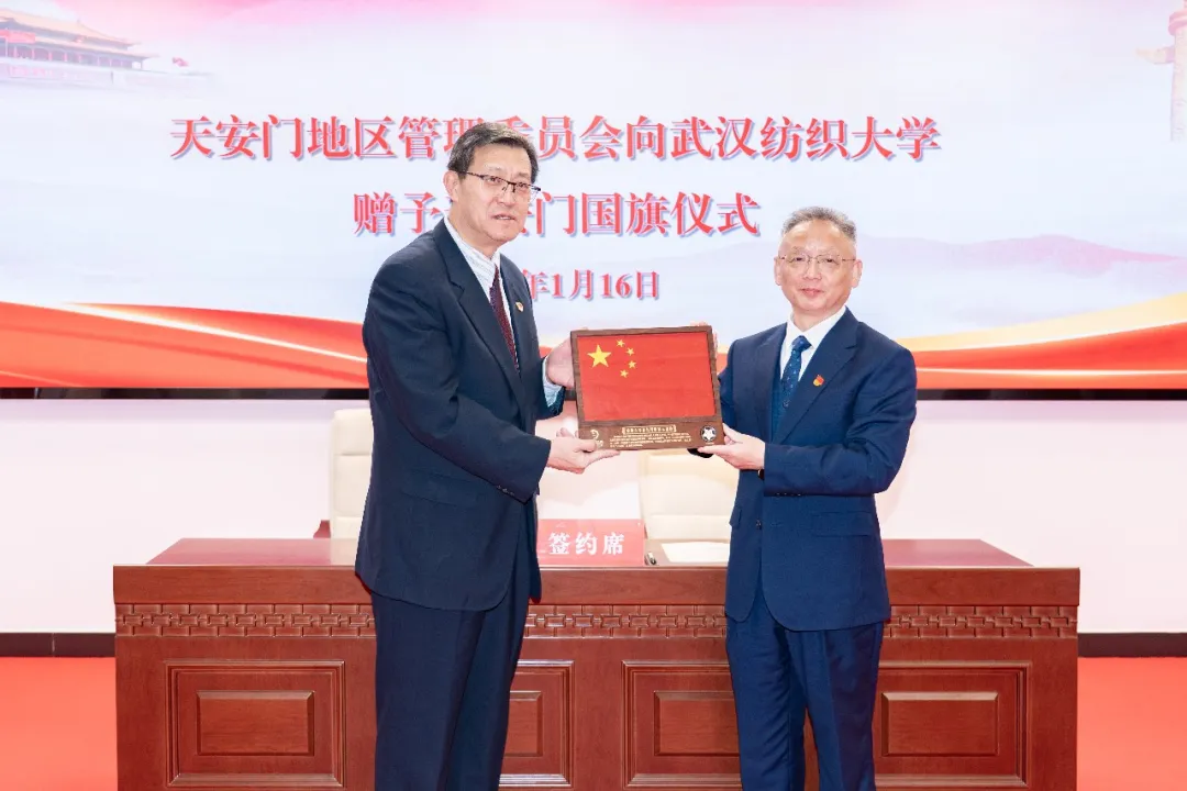 罗锦银代表学校向天安门地区管委会致以诚挚感谢,简要介绍了学校的发展历程、办学特色和重大科技成果,并就学校获赠天安门国旗的保护及使用方案作说明。他表示,天安门广场升起的每一面国旗都是崭新的,拥有独一无二的编号,十分珍贵。天安门地区管理委员会将2020年12月3日在天安门广场升起的国旗赠予武汉纺织大学,是对学校争创一流的巨大鼓舞和极大鞭策。迎领天安门广场国旗为纺大人奋力实现“双一流”建设突破凝聚了精神力量、积蓄了澎湃动力,学校将严格按照相关法律法规,妥善保管使用,在国防教育馆全幅展示,与嫦娥五号、六号月面国旗并置,讲好国旗故事,弘扬爱国主义精神,传承红色文化。