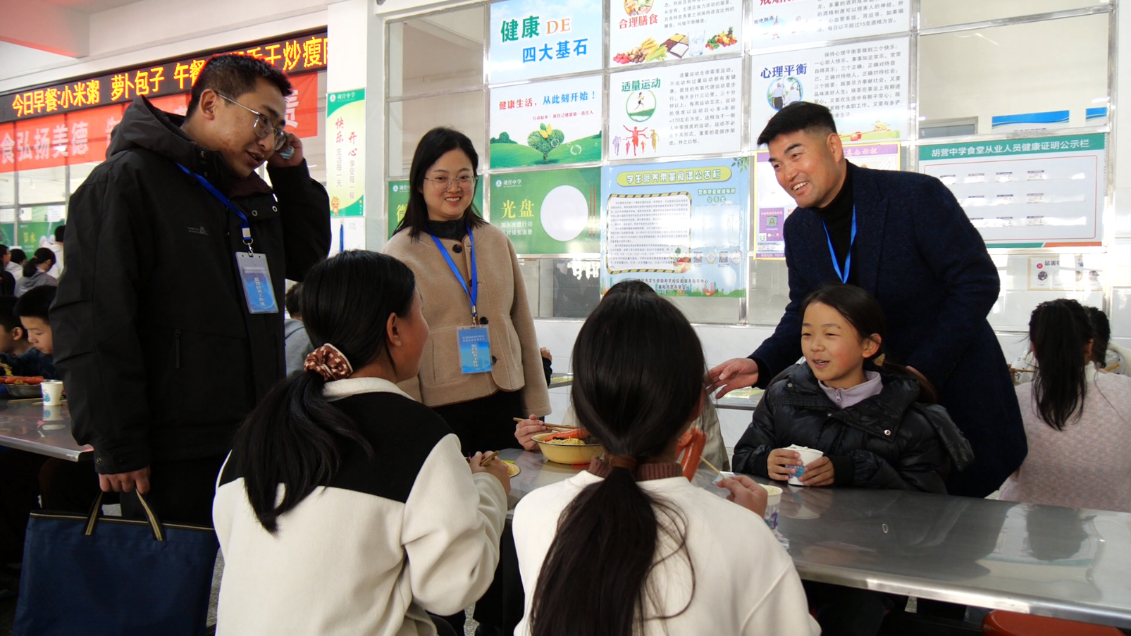 南漳县纪委监委聚焦校园食品安全,组织纪检监察干部深入一线监督检查。图为近日,该县纪检监察干部在胡营中学食堂,查看食堂运营情况,与用餐学生面对面交流,倾听孩子们对食堂供餐的感受。(南漳县纪委监委供图)