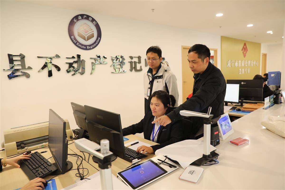 崇阳县纪委监委深入窗口一线了解不动产登记服务质量等情况,督促相关职能部门优化业务办理流程,切实增强群众的获得感与幸福感。图为该县纪检监察干部在县不动产登记中心服务窗口了解相关情况。(崇阳县纪委监委供图)