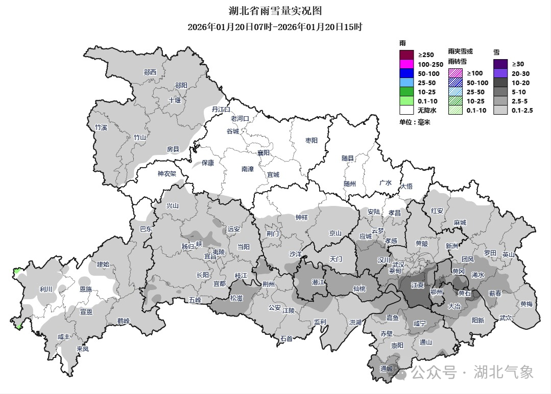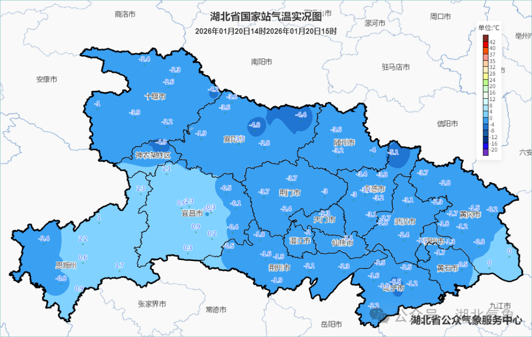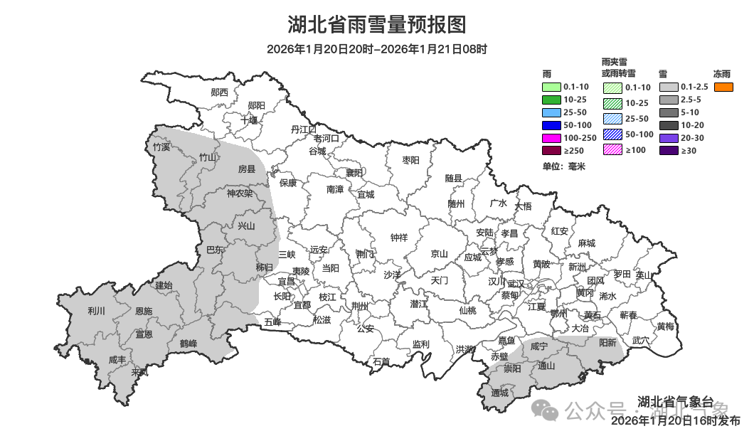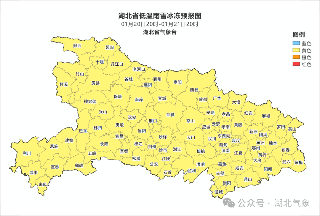 预计1月20日20时至21日20时,全省大部分地区有积雪,最低气温≤0℃,鄂西北、鄂西南、鄂东南部分地区仍有小雪,请注意防范。