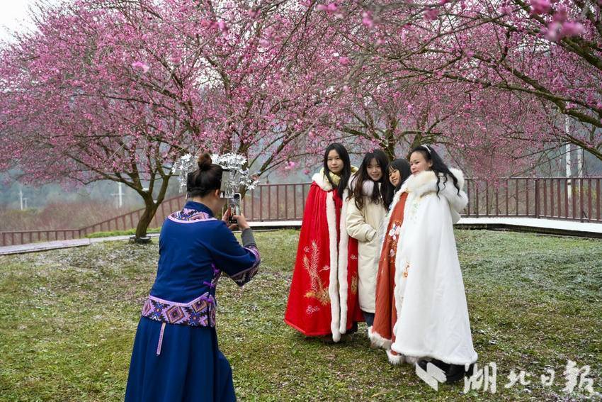 “今年梅花花期较往年提前了约半个月,从本月起,各地游客便陆续前来梅园游玩,近两周每周游客人数均突破一千人左右。”来凤县革勒车镇党委副书记张溥瑶介绍道。