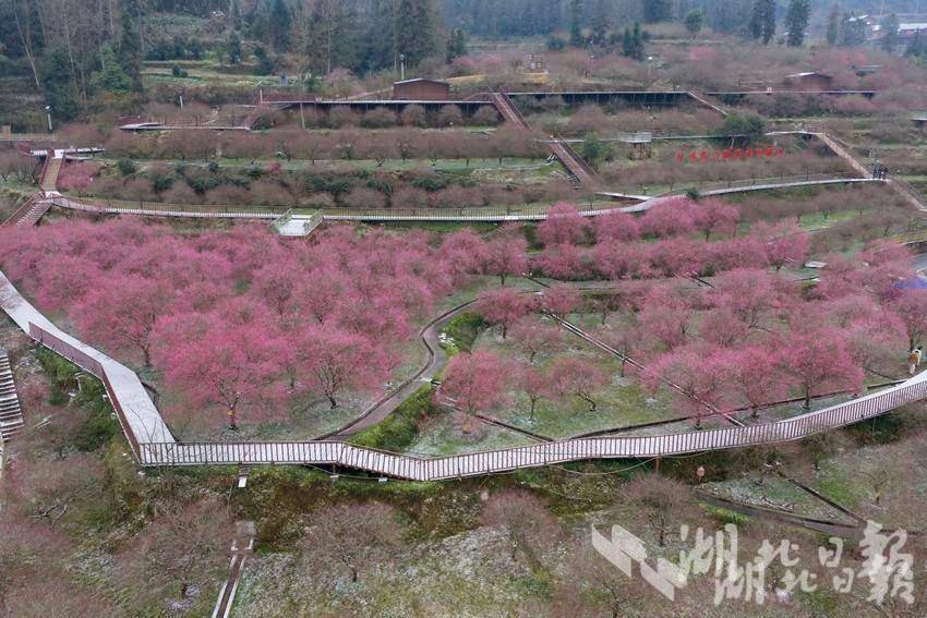 湖北日报客户端讯(通讯员陈燕利、郑雨萌、向雪)1月21日,一场降雪过后,来凤县革勒车镇正南梅园银装素裹,1200亩梅花竞相绽放,粉白玫红的花瓣缀满枝头,与远山相映成趣,吸引了大批市民游客慕名前来踏雪寻梅,尽享冬日雅趣。