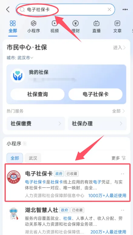 第一步:微信或支付宝首页搜索“电子社保卡”,点击进入【电子社保卡】小程序。