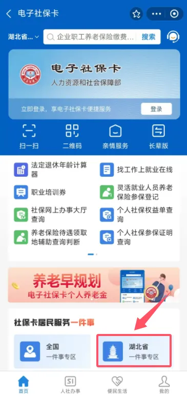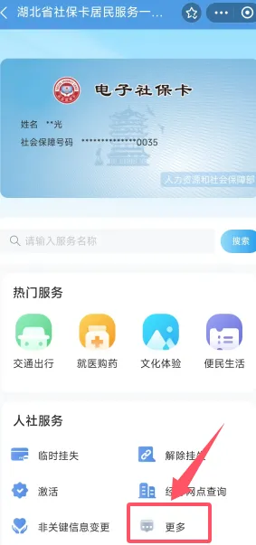 第二步:在“电子社保卡”小程序中,点击【湖北省一件事专区】,进入专区后,点击“更多”。