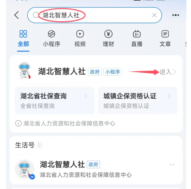 第一步:支付宝首页搜索“湖北智慧人社”,选择【湖北智慧人社(小程序)】,点击“进入”。