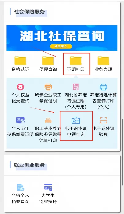第二步:进入“湖北智慧人社服务大厅”后,下划至“湖北社保查询”,在该栏目下的【证明打印】中选择“电子退休证申领查询”,点击进入。